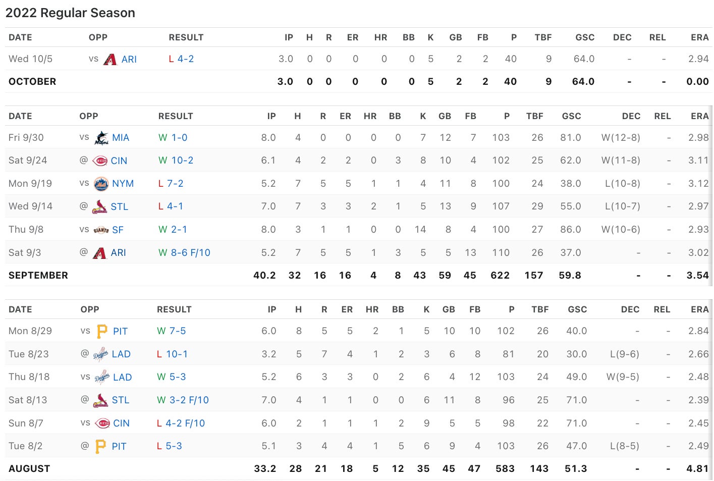 All in all, a rough August followed by an alright September. I don't think the Brewers missed the playoffs because Corbin Burnes had a 3.54 ERA over the last month. Maybe if I dug into some advanced stats that had a few letters, and symbols in it like WVARP+^ I could make a case. But I think other players on the Brewers not being as good as Corbin Burnes could be the reason the Brew Crew missed the playoffs.