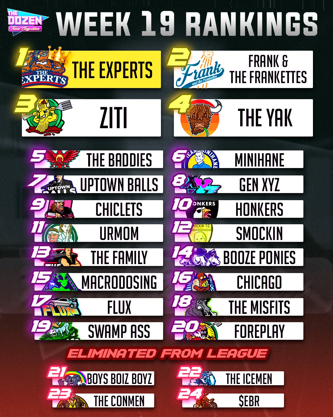 Week 19 of the Dozen is here, and it’s a big one. We open with this season’s first official Crown challenge between The Experts and Frank & The Frankettes. Paddy the Baddy returns to the Dozen as The Baddies look to remain undefeated. To end the week, we have last season’s MVP (Kirk Minihane) facing last season’s Rookie of the Year (Rudy) as Team Minihane takes on urMom. Our correspondent Scoops L'Aguirre has the breakdown…