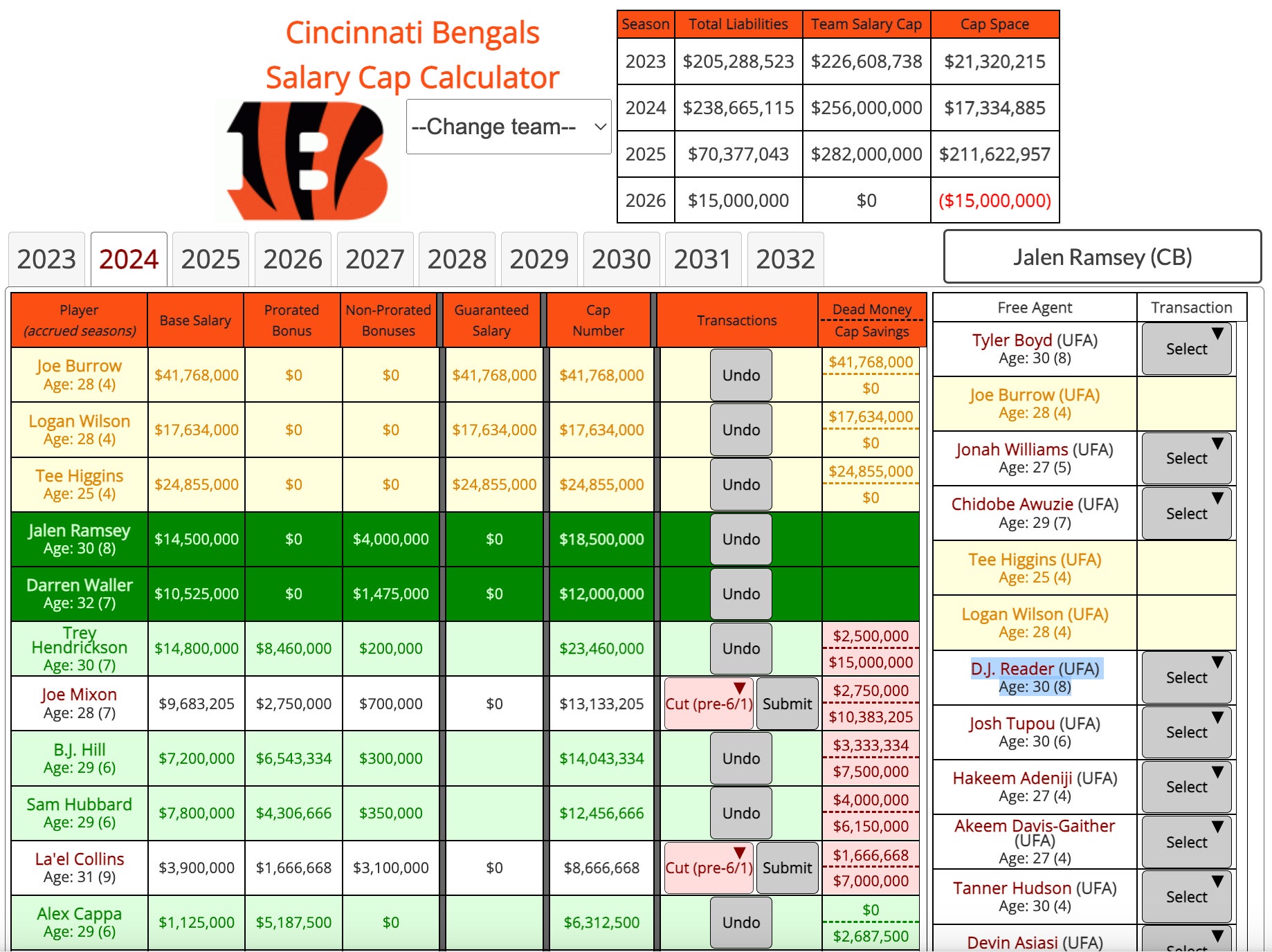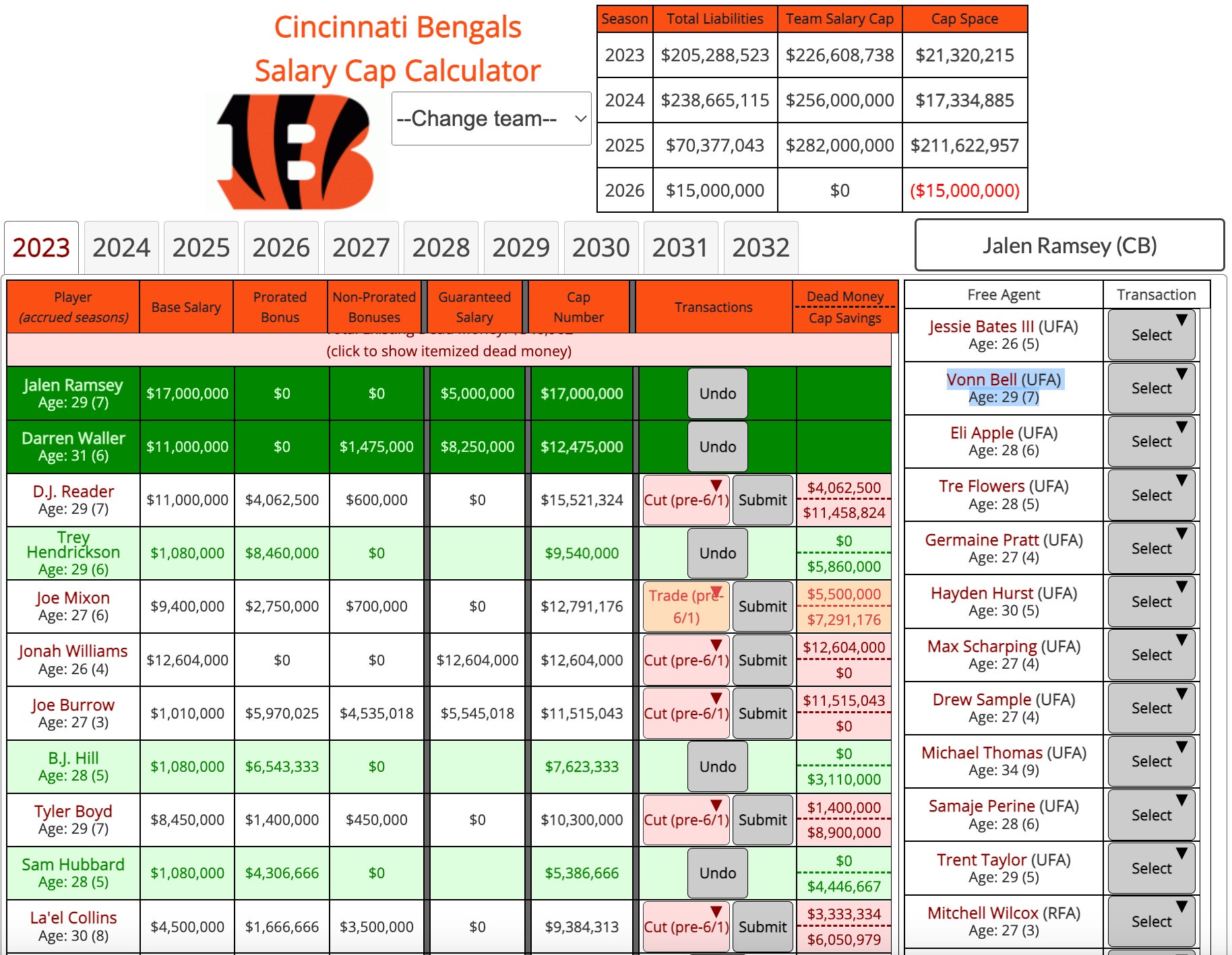 You can see safety Vonn Bell highlighted as the free agent I'd like to keep this offseason, along with Reader in '24. Notice how I didn't even get rid of Joe Mixon or La'el Collins, who are among the starters whose futures are the most up in the air at the minute. That could save Cincinnati all sorts of space if they're let loose before they're free agents in 2025.