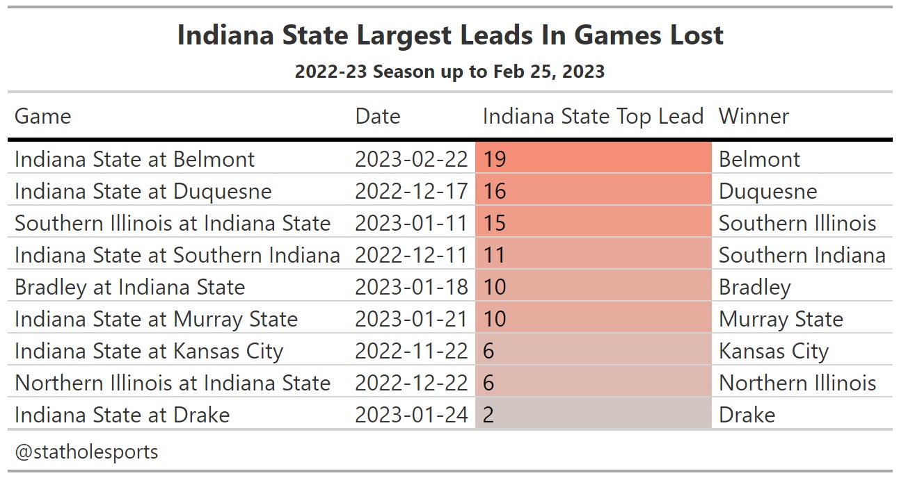 B. (Incorrect) A really good guess which means: wrong. While not the worst, here are all the top leads Indiana State held before blowing it and losing: