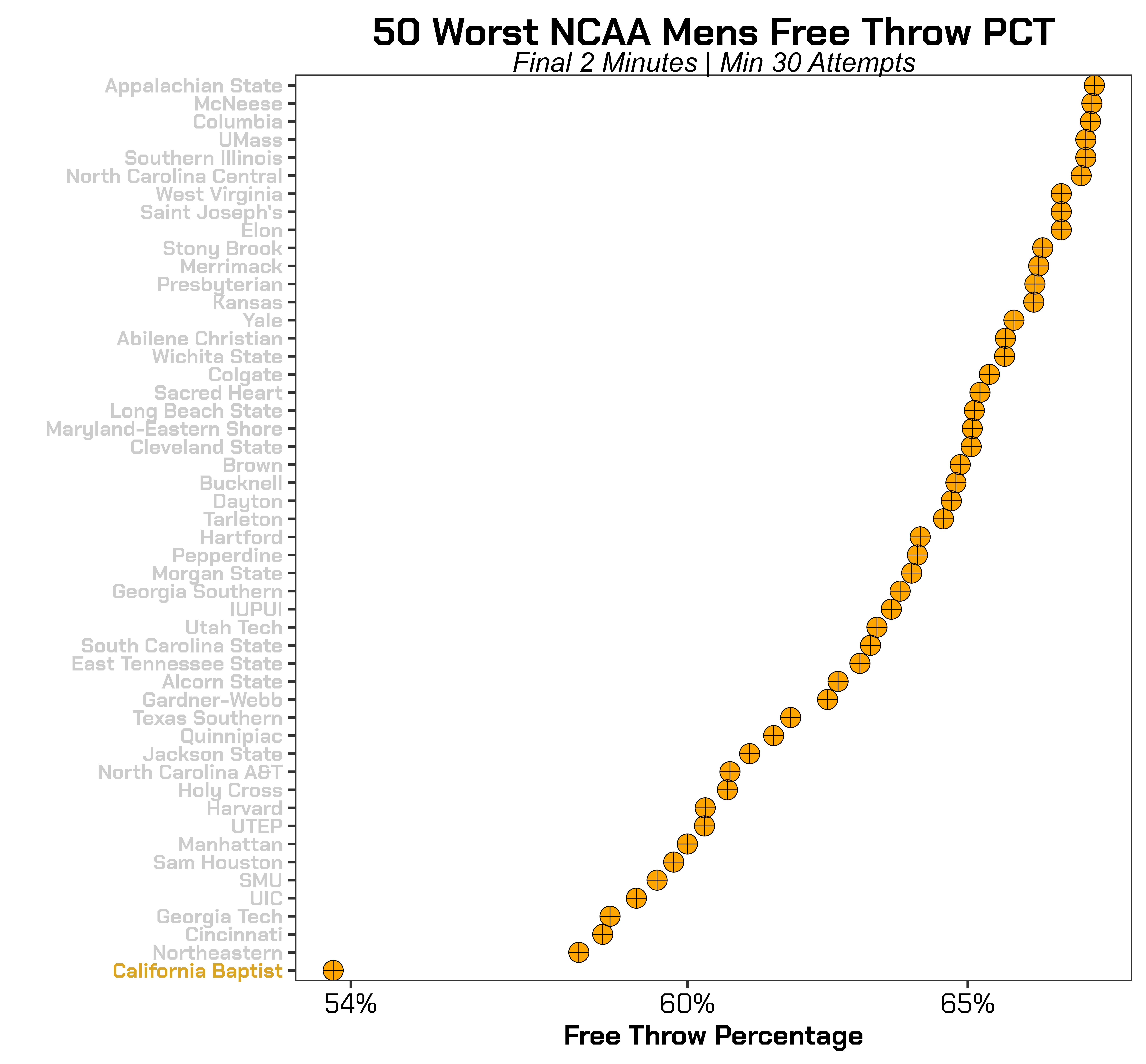 A. (Incorrect) We're going in order of saddest cautionary tale here so - spoiler alert - the answer is "E". Anyway, no team has a worse free throw percentage in the final two minutes in all of college basketball than California Baptist. Seems John the Baptist must have been more of a la-cross guy.