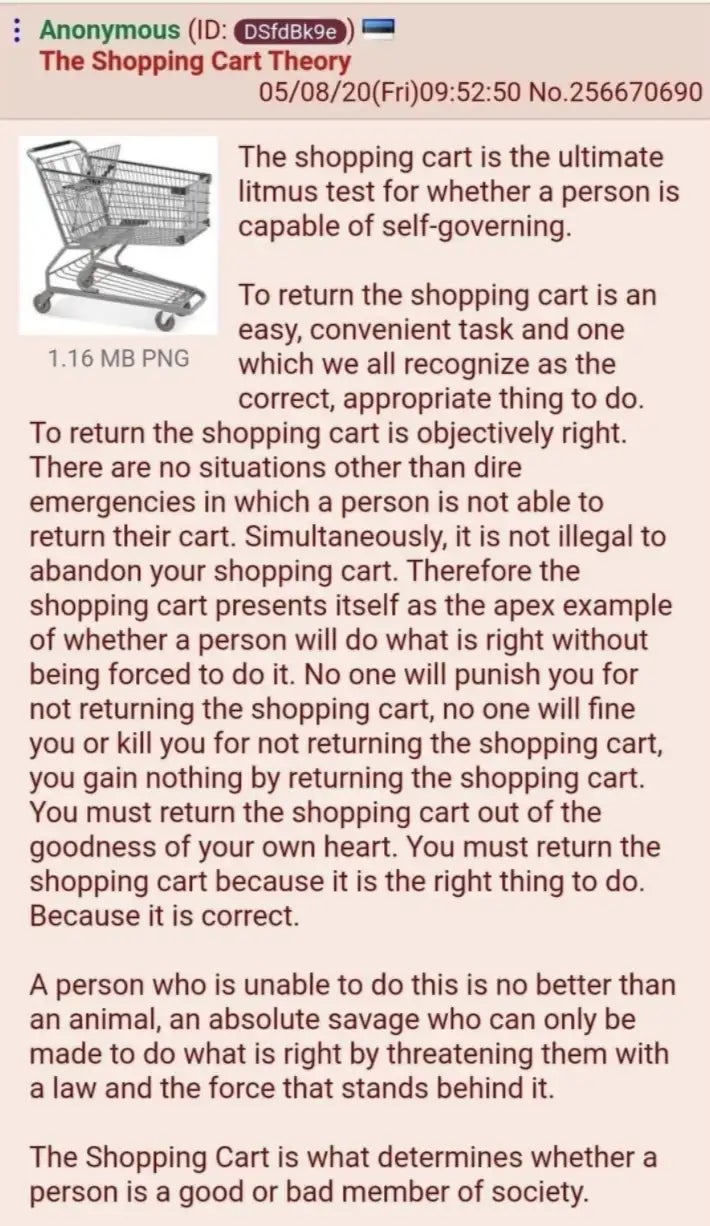 A few years back, before civilization really went to shit, there was a really big "test" meme going around on social media dubbed "the shopping cart test".