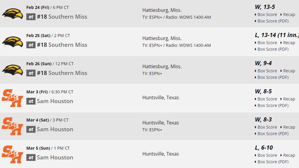 Solid series win at Sam Houston improving the season record to 6-4. Good shit seeing the boys hang 22 runs ont he road. That's 57 total int the last 6 games.