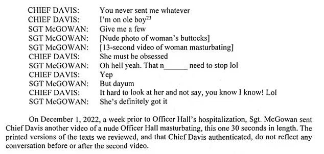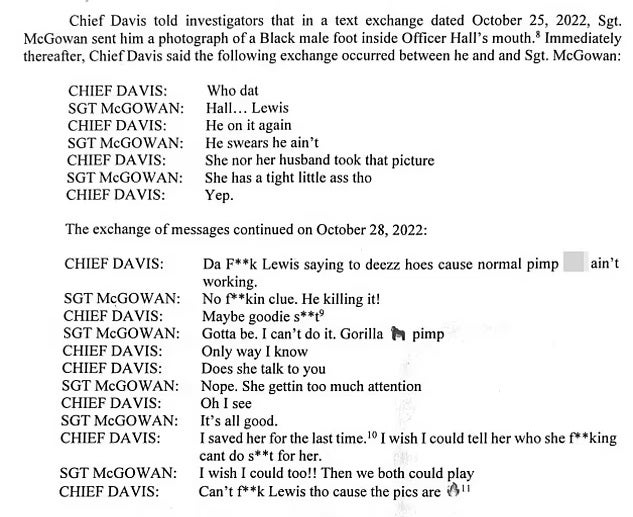 In October last year, McGowan sent Davis a photo of a 'Black male foot inside Officer Hall's mouth', saying that the appendage belonged to Powell.