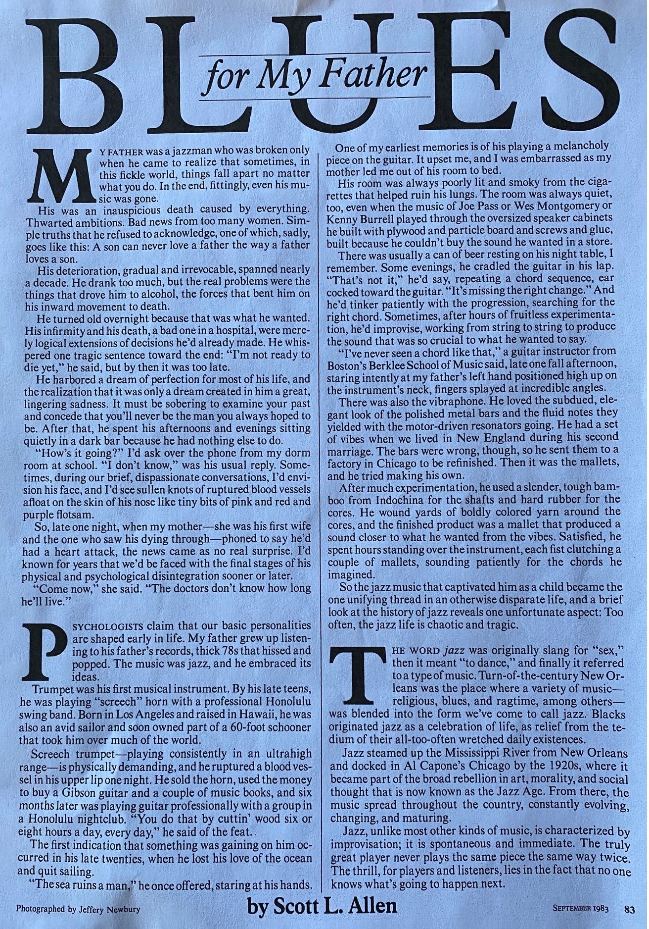 Years passed, and I lost track of Crazyboy. In 1983, Crazyman passed away. He was only 53. In September of '83, Scott wrote an incredible article titled "Blues for My Father" that was published in San Francisco Magazine. It was an incredibly honest story about his father's life. The publication's description in the index read, "The word jazz conjures up images of smoky rooms, sinuous women, desperate men. A son reflects on his father, a jazzman who spent his life searching for the perfect woman and the perfect chord." Crazyboy sent me a copy, and I read it with tears in my eyes, being all too familiar with Crazyman's story.