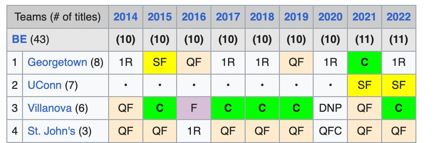 With 4-5 minutes left on the Sportsbook stream, St.John's fan Glenny Balls pointed out that St.John's has not made the conference semifinals since 2000. Now, I remind you, St.John's plays a few home games in Madison Square Garden where this tournament has been played since it's inception. I was astounded. Have not made the SEMIFINALS in 23 years ! 23 Years. Literally astonishing stat.
