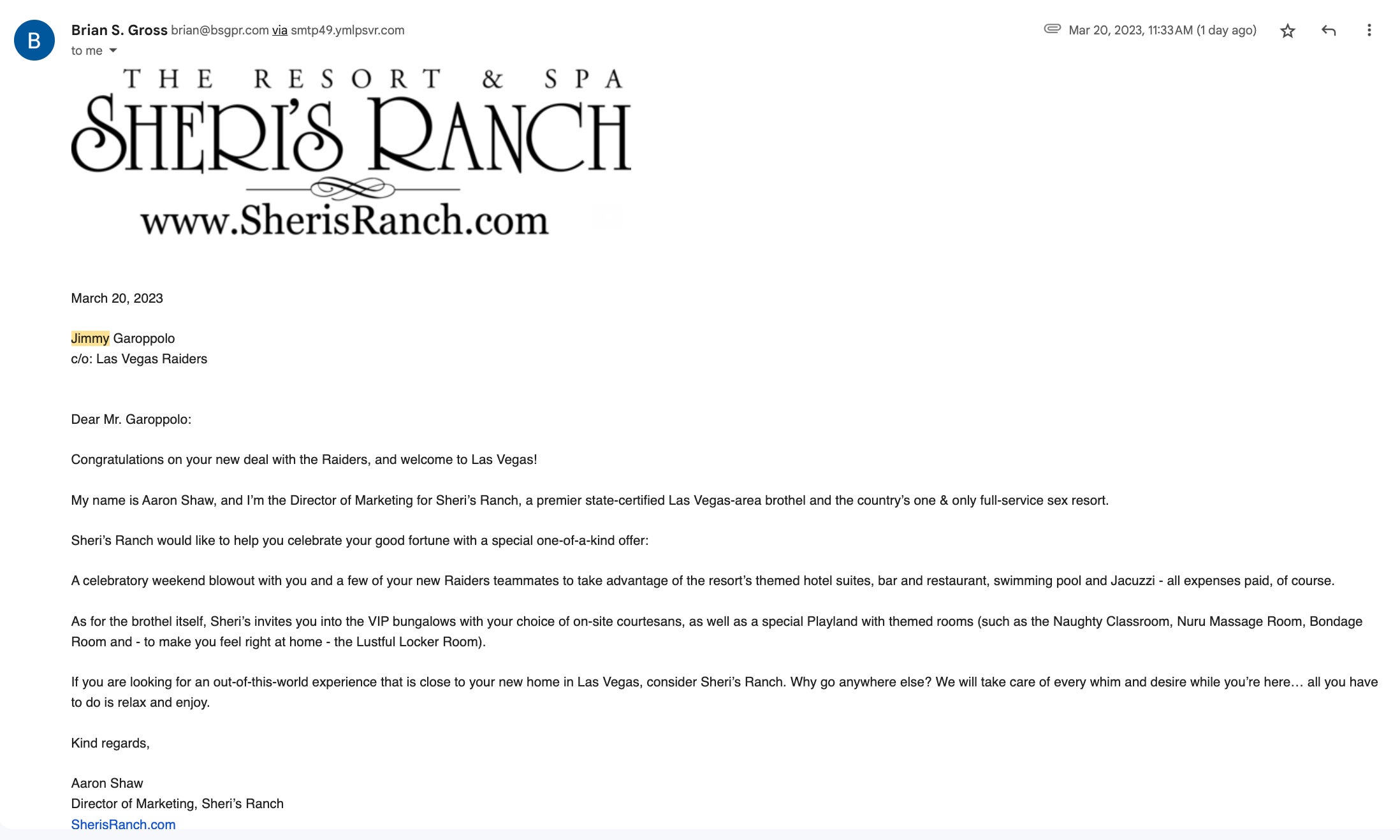 Shockingly, The Bunny Ranch wasn't the only den of iniquity that didn't get the memo because Sheri's Ranch is also trying to court the new Raiders QB.