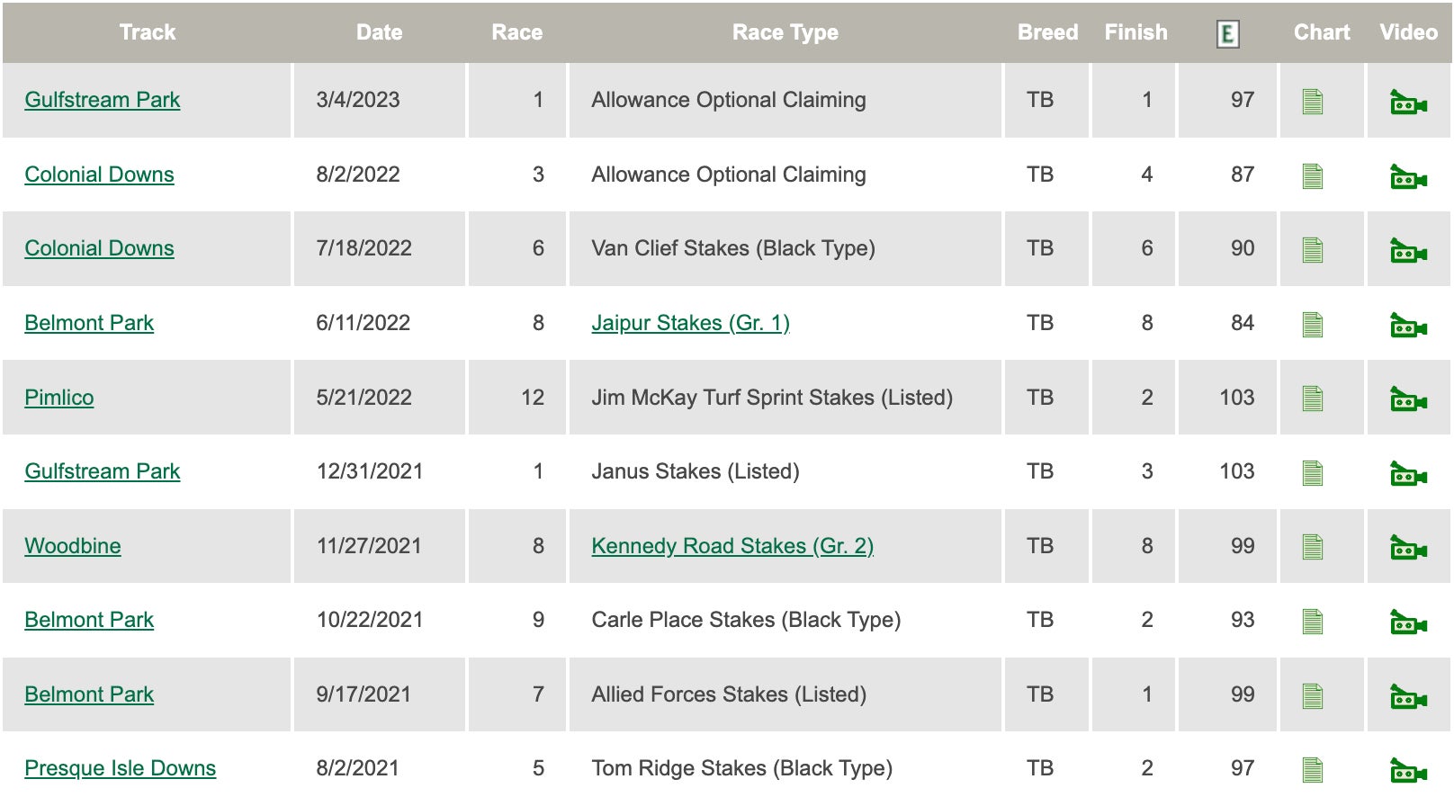 He's so damn handsome! He's also a pretty damn good horse, too. He's earned about $250,000 through his age 4 year. Check out these Equibase speed figs: