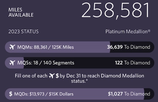 Most people turn their phones off airplane mode to check their texts when they land. But I became so obsessed with chasing diamond status that I would refresh my Delta app as my first phone check upon landing. Still, as the year and my window for achieving Diamond came to a close, I was furious for not having attained the card earlier. You see, I got the card in May, and most people need the full year to achieve Diamond. This was how close I got: