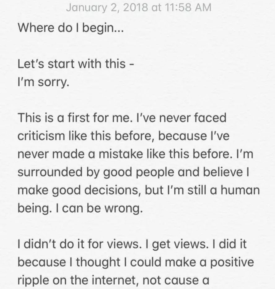 In terms of notes app apologies it falls somewhere in between Ja Rule's "My bad about Fyre Fest" atonement & Logan Paul's "Sorry for posting footage and making jokes next to a man's dead body"; not the most effective and makes you look even worse in the moment.