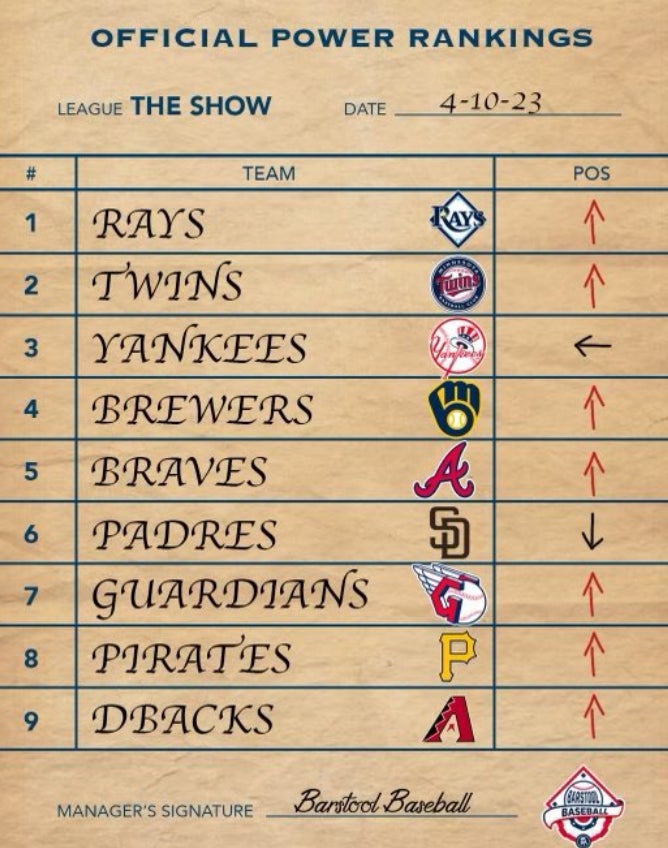 Currently I'm getting shit on for the Braves ahead of the Padres. But again, if you watch the show, you'll see exactly how that played out. Klemmer (hitting in the 5 spot) liked the Braves more than the Padres. We talk about Sunday Night Baseball about to start and the impact that has on the rankings. The Padres would need to beat the shit out of the Braves convincingly for this to come back is something along the lines of what I said. This is the only dead time 4 grown men can reflect on a week's worth of baseball for a Monday morning. And as luck would have it, the Baseball God's smited the shit out of us.