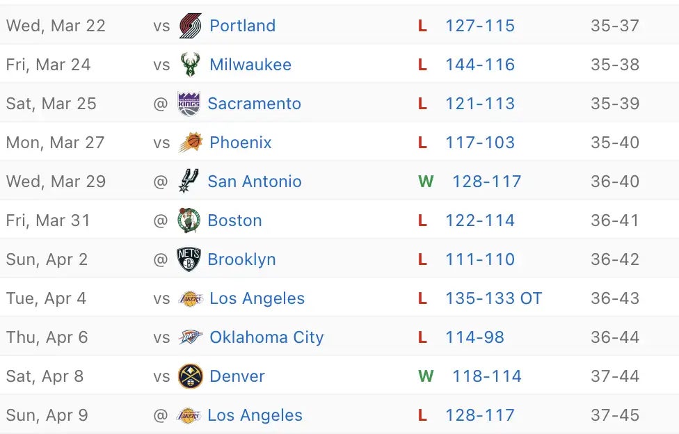 A quick reminder for those who may not have seen that blog, the Jazz had won 4 of 5 heading into their 3/22 game and were still in play for a top 10 seed. Danny Ainge immediately sat everyone and tanked, resulting in this stretch