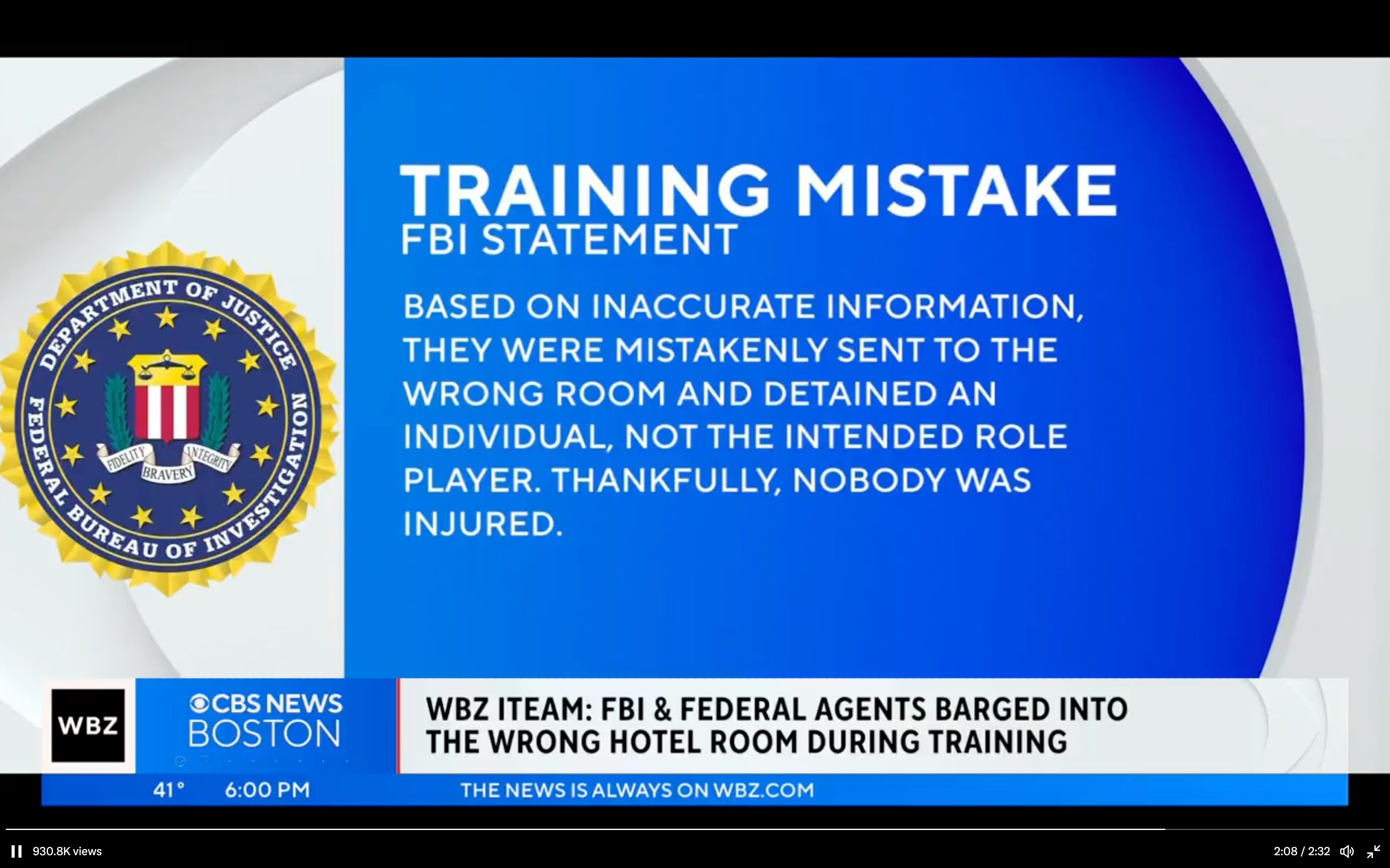 “Based on inaccurate information, they were mistakenly sent to the wrong room and detained an individual, not the intended role player,” the FBI said.