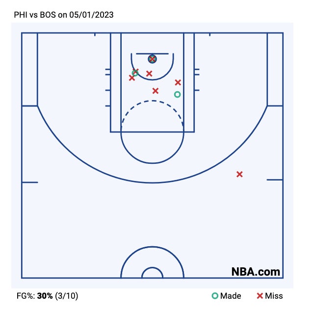 As a team, they only shot 26 3PA and finished at 38.5%. It was clear there was no rim protection and the Celts didn't settle. They were aggressive. That's the good news. With Embiid out and hobbled when he does return, the Celts need to keep exploiting the paint. They just also need a better balance of getting back to their normal shot profile, and you'll see why shortly.
