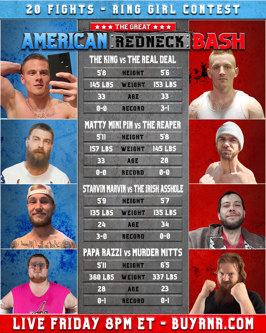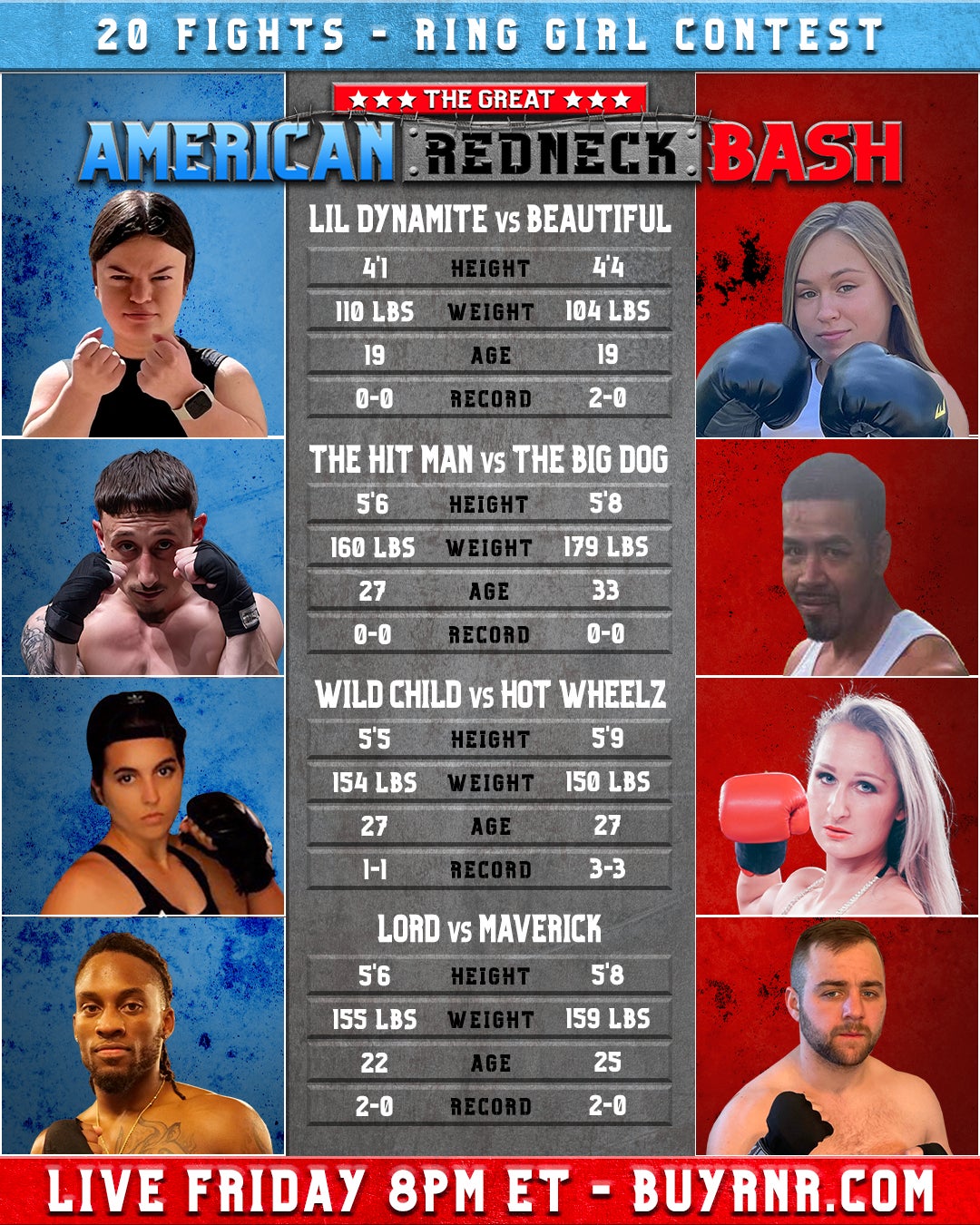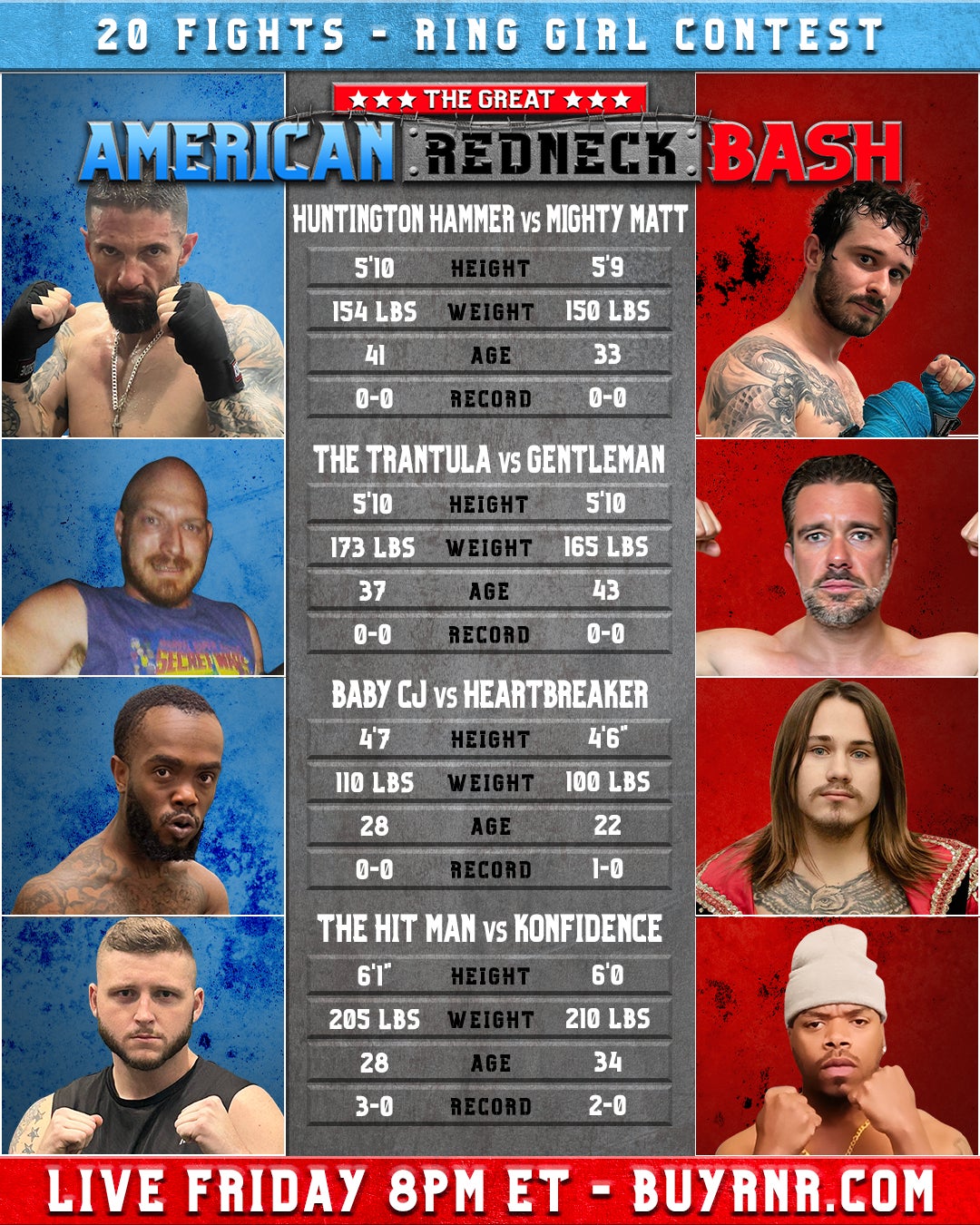 The possibilities are as endless as the madness that's coming this Friday night. We have 20 brawls with no headgear, 2 title fights, multiple #1 contender matchups, dwarfs are back, 350+ lb fighters, trans vs trans, live ring girl contest, we got it all coming.