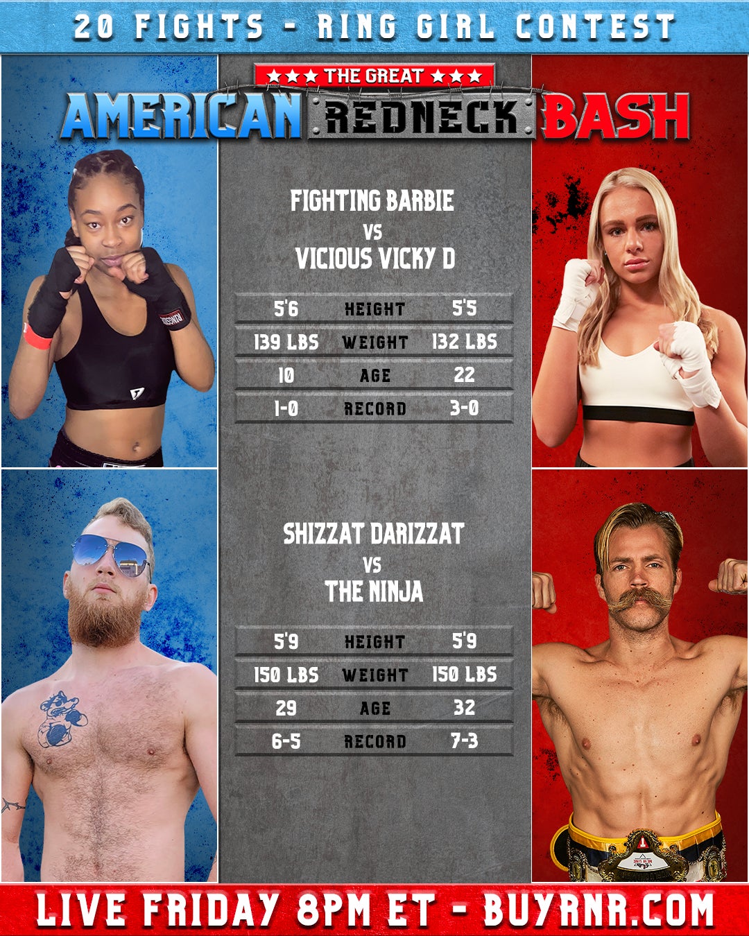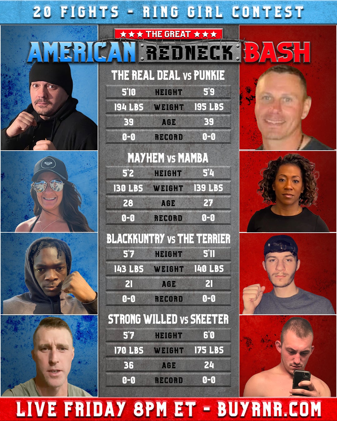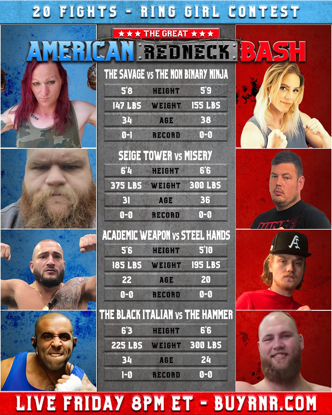The possibilities are as endless as the madness that's coming this Friday night. We have 20 brawls with no headgear, 2 title fights, multiple #1 contender matchups, dwarfs are back, 350+ lb fighters, trans vs trans, live ring girl contest, we got it all coming.