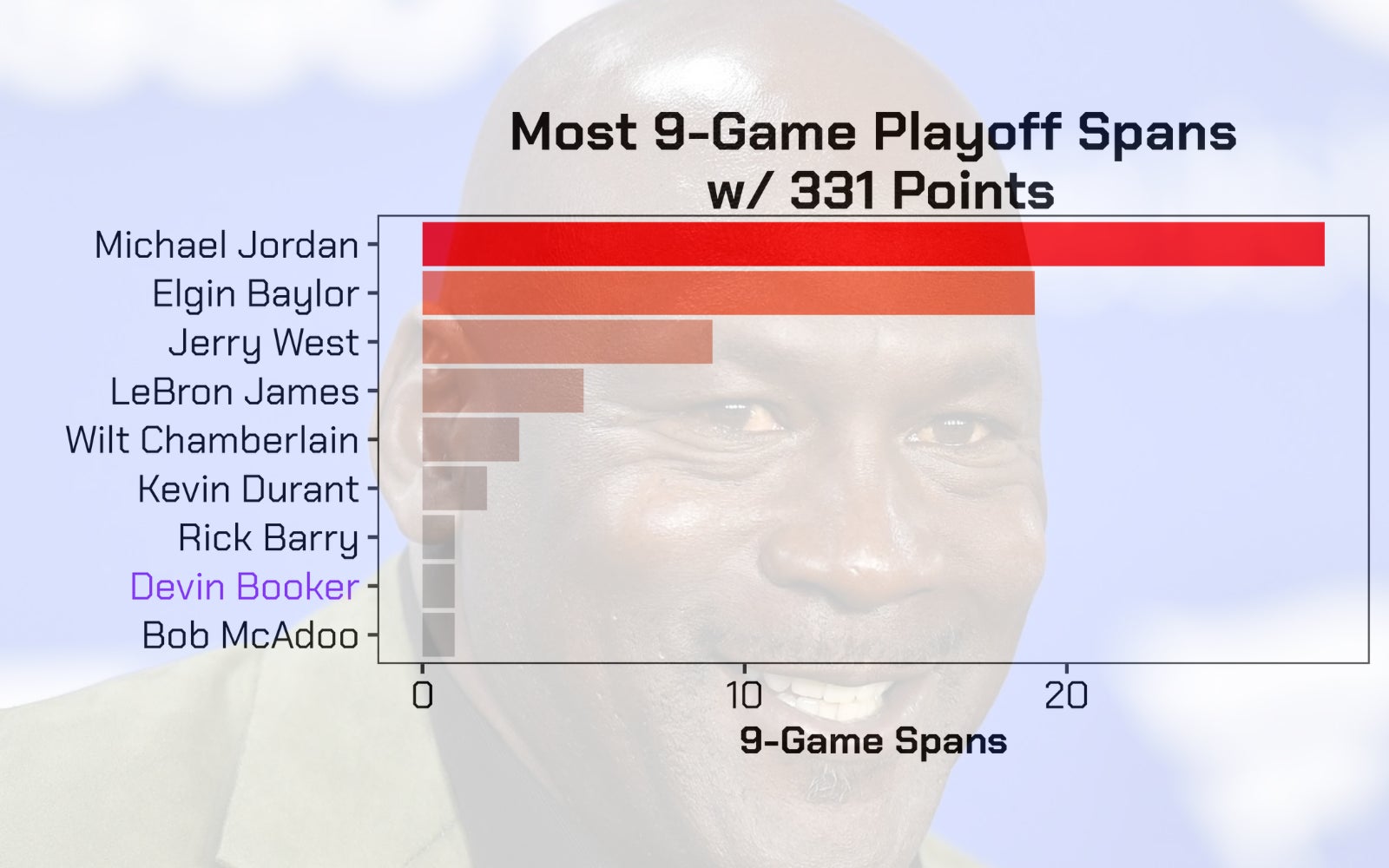 For those keeping score at home, that's 331 total points in his first nine playoff games of 2023. That puts him in elite company for most playoff games with 331 points across a nine game span. Here's the full list with Devin Booker's name in Suns purple font to make it clear this graph is about him.