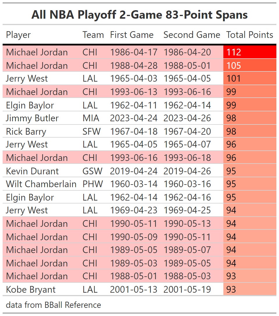 But this blog isn't about Michael Jordan. My childhood hero doesn't need me reminding everyone why the thought of him not being the best baller of all time is flat out laughable. We can let the past be the past and just revel in the blossoming of the present. This is Devin Booker's moment and it should be celebrated with some good ole fashioned stat porn to showcase how insane of a playoffs he's having so far in 2023. Let's start with his last two games. 83 total points. I know scoring comes easy in today's game, but this is still stupid good and gives Book a SECOND 2-game playoff streak of scoring 83+ points. Here's where he stands in the all-time list of most two playoff game spans: