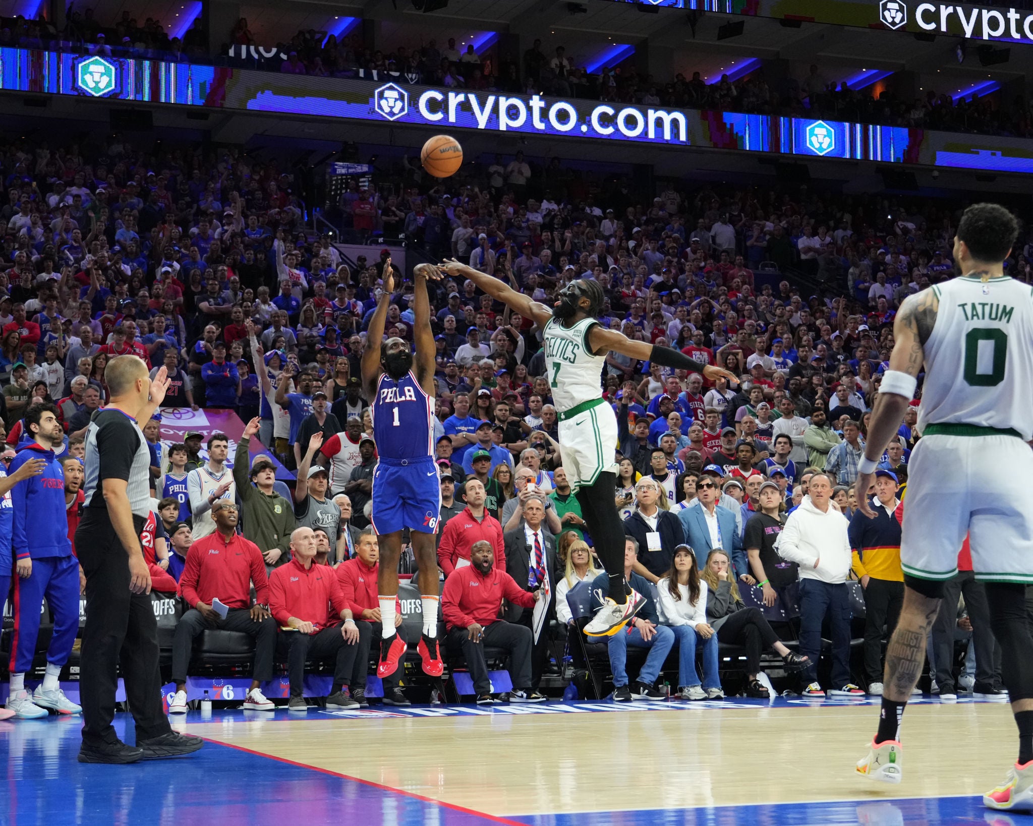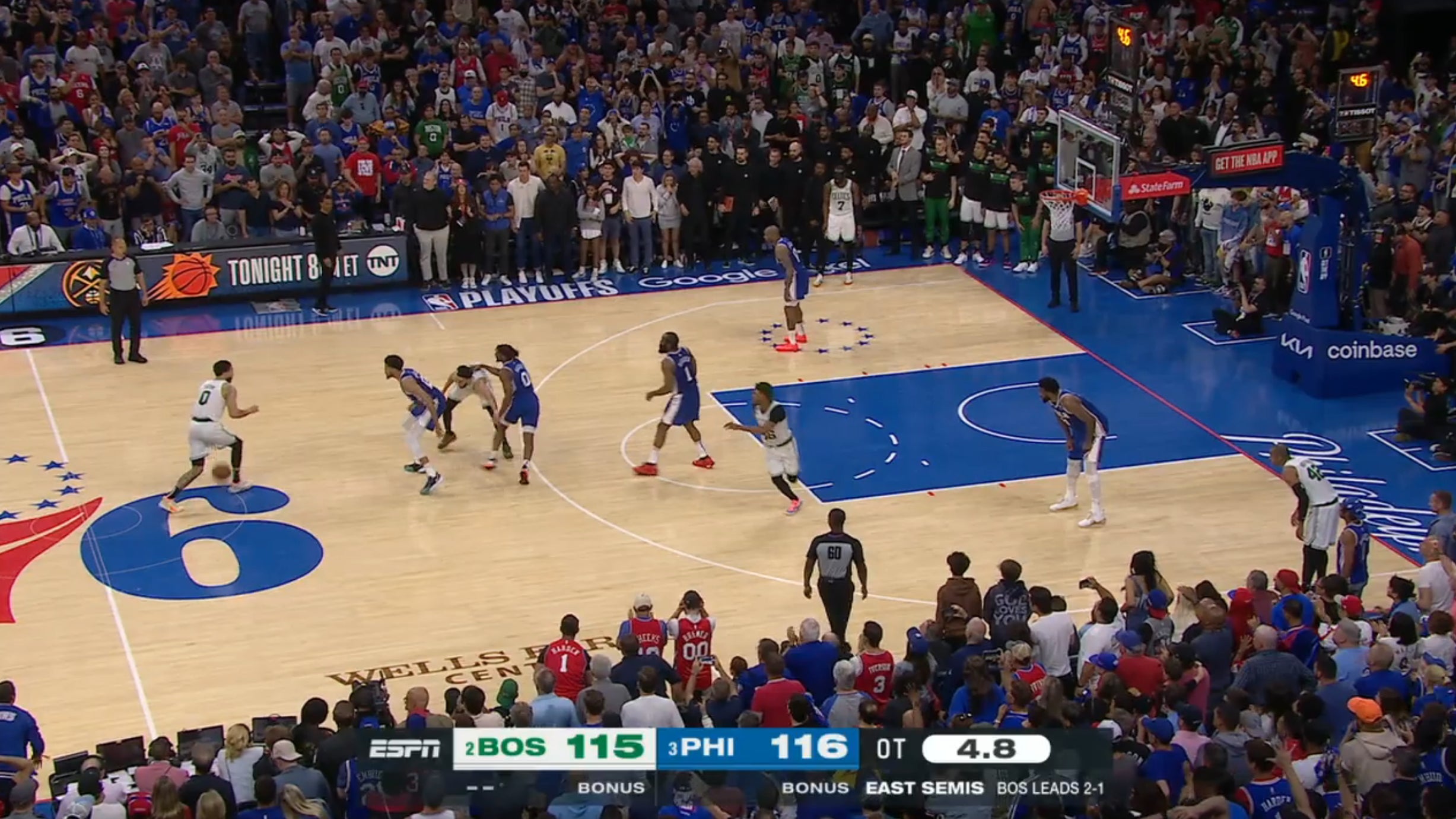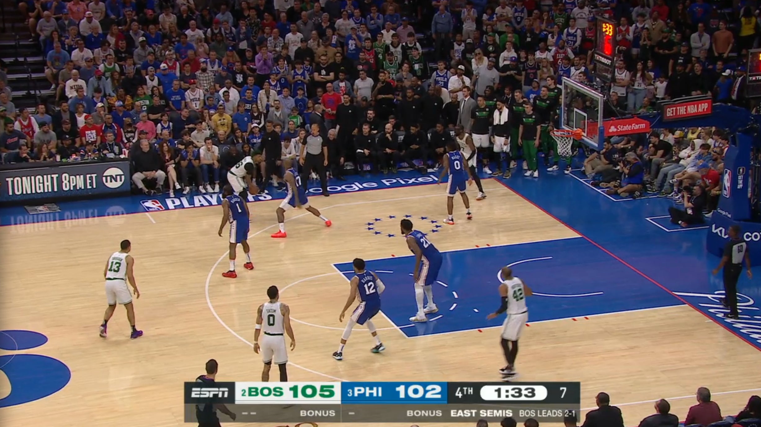 - A lot will be made about the ending, but let's also not forget what happened immediately following that Harden blow by layup. The Celts didn't really do anything with purpose on their next offensive possession, and that resulted in Smart having to take a contested 3PA with about 1:30 left that missed. 4 of the 5 Celtics touched the ball on that possession, everyone but Jaylen. Smart brought it up and gave it to Tatum who had Maxey posted up at about the elbow. Tobias Harris came to double, so Tatum swung it to Horford, who swung it to Brogdon, who took a dribble and did nothing, only to give it to Smart with about 7 seconds left on the shot clock. Harden hedged over which cut off the drive, and that Smart 3PA was basically the only shot available