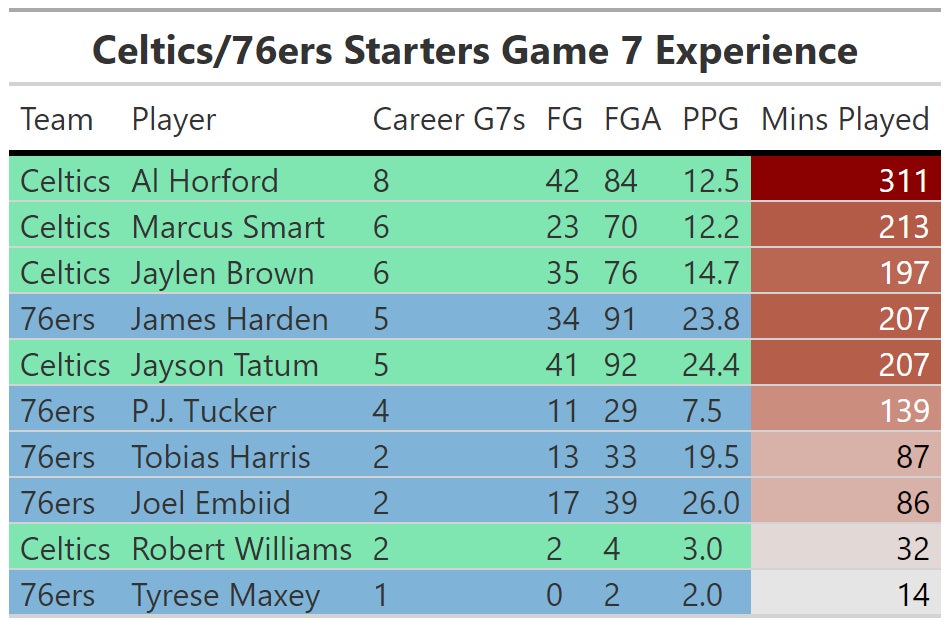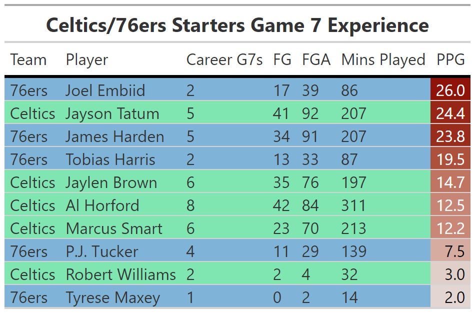 Then there's the visitors. The Philadelphia 76ers. While the Game 7 experience chart above seems to favor the Celtics, 76ers fans can easily Rorschach it around a bit to make it seem to favor them. Who cares about how many games the Celtics have played when three out of the top four starters in Game 7 PPG will be 76ers?