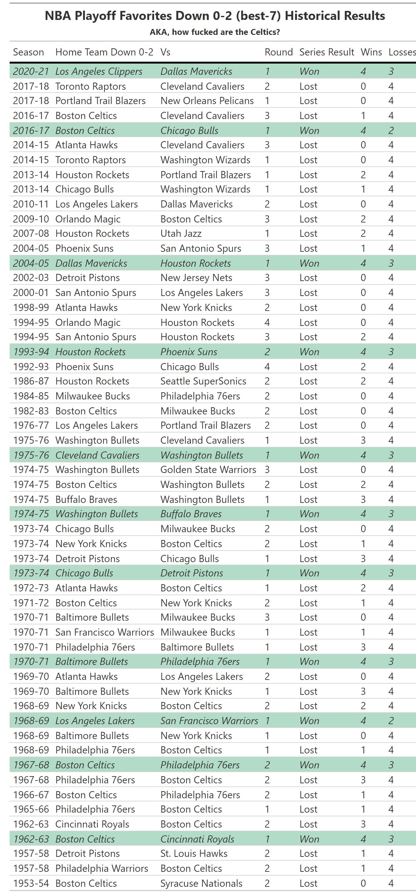 Is this a sad, grasping at straws way of building confidence? Absolutely. 100 percent. But what else is there to do when a team blows their first two games at home? But who knows. Maybe the Miami sun will give Jayson "Wilting Clover in the 4th" Tatum the vitamin D he needs to sprout a point in the fourth quarter. If Miami is about as streaky a team as the Celtics, maybe the pendulum swings. Anyone that plays blackjack knows winning your first two hands means nothing. So all in all, there's a lot of series left (unless they lose today).