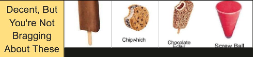 Fudgesicles are so interesting. They're not hard chocolate and kind of melt in your mouth. The taste is terrific, the one knock is it's not versatile at all. Chipwich is great, but homemade ones are better and crunchier. The mass produced ones are ok, but you don't feel the cookie as much as you should in my opinion. Chocolate Eclairs are similar to the Strawberry Shortcake, but doesn't offer that fruity dimension. Screwballs are good and have a nice gum ball at the bottom but I'm not sure they'd be anybody's go-to.