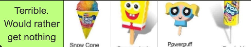 Snowcones if they're fresh as decent and a different kind of treat. Premade ones are absolute trash. Spongebob and Powerpuff pops are lame and I hate these extra cause I once choked on a Super Mario gum ball eye as a youth. That being said, they're still better than Pop Ups.