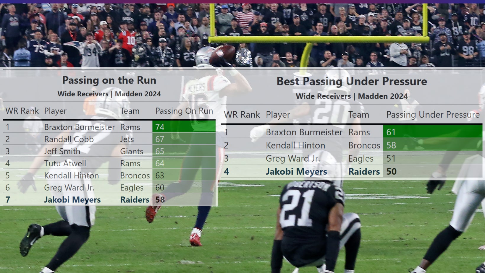 Over 200 wide receivers have scores for "Passing on Run" and "Passing Under Pressure" and Jakobi Meyers is 7th and 4th best respectively. I'm not sure fantasy managers in a tight playoff game last year would entirely agree with this assessment. But maybe EA Sports figured it was an intentional interception??? I mean, he did put it on the numbers. This makes me think of all the receivers getting caught betting on the NFL, Jokobi going down next would be the least surprising. And definitely the most hilarious.