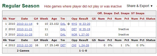 The fact that Madden assigns "ball carrier vision" to a defensive tackle is why I love Madden data. And it allowed me to come across easily the saddest player ever - Jimmy SADdler-McQueen. Let's all study his career games log below together and count how many total plays in the NFL he played from 2010 to 2012: