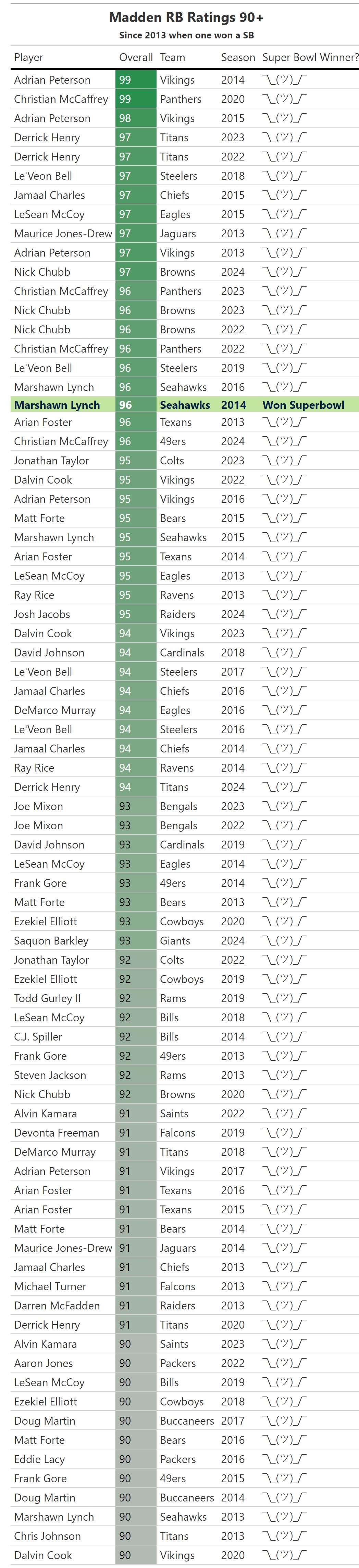 Since Madden ratings are the language of NFL players, let's see how the best of "one of the most important positions in the game" has done from a Maddenlytics standpoint. I think we can all agree there should be at least ONE running back that won a Super Bowl with a 90+ rating since 2013. Remember, Madden seasons are one ahead of NFL seasons because reasons. Get those thumbs ready - let's have a look at every running back rated 90 or higher: