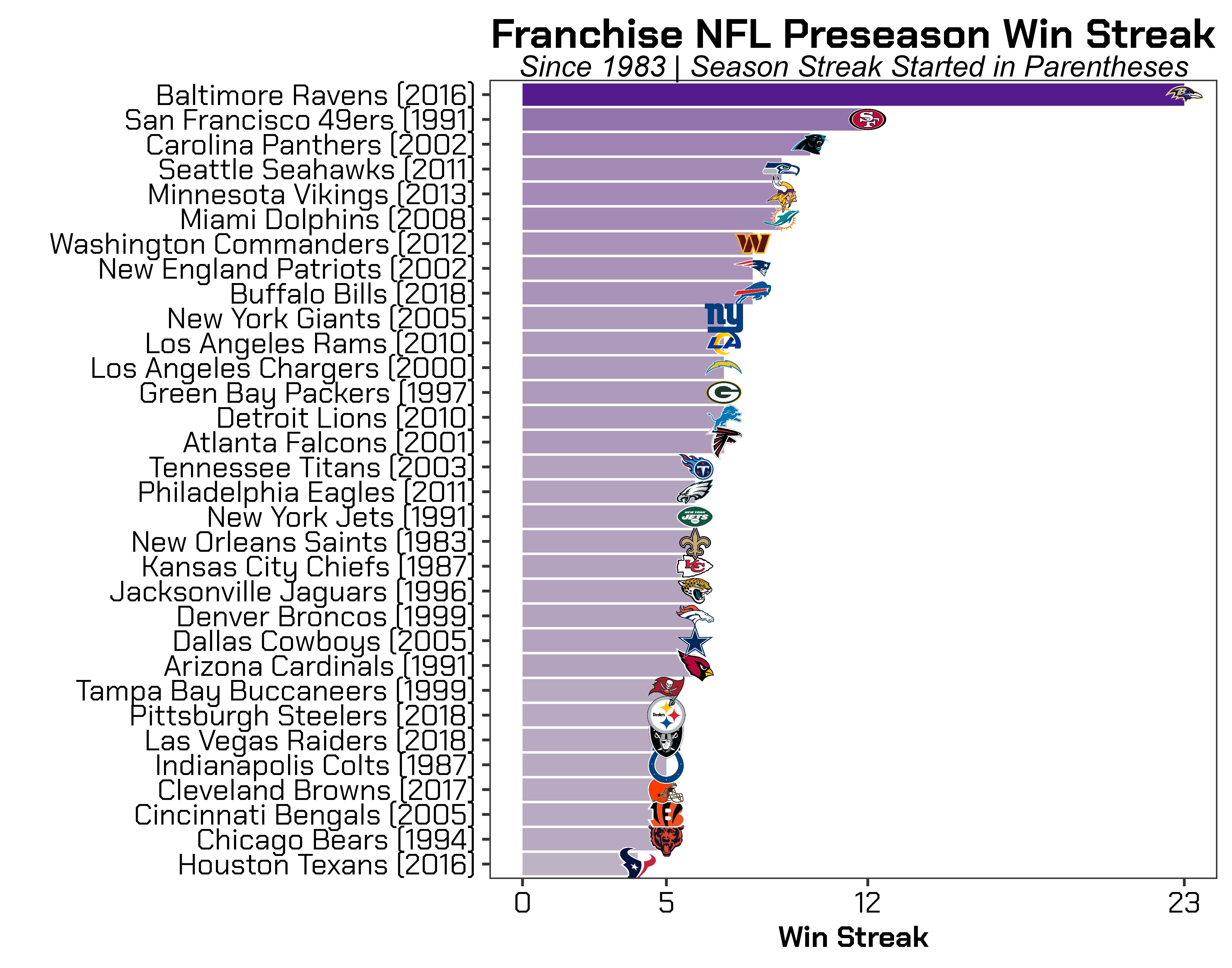 I did the grunt the work to figure each team's longest preseason winning streak at any point since 1983 when pro football reference starting tracking results. While 2nd place San Francisco has an impressive 12-game all-time streak, they are Kobayashi to the Raven's Joey Chestnut: