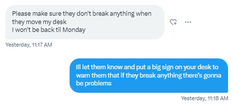 Note to Frank: I'm afraid I might have let you down. I left a note on your desk that said "Please do not break anything", but I am not confident that was taken seriously by the demolition crew we hired. I'm sorry Frank.