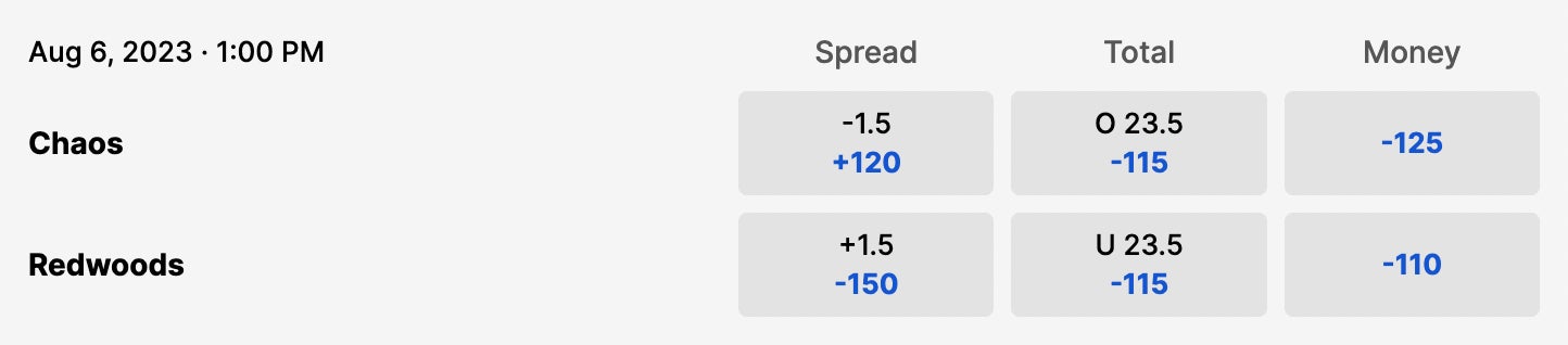 The Redwoods desperately need to turn things around here. They've had a couple of bad weeks back-to-back here after such a hot start to the season. The Chaos dropped a close one last week against the Whipsnakes, but they've been playing some really consistently solid lacrosse lately. I like this game to be the closest of the weekend, so I'll go ahead and grab Redwoods +1.5. But something tells me that a wild goal from Josh Byrne will end up being the difference maker here.