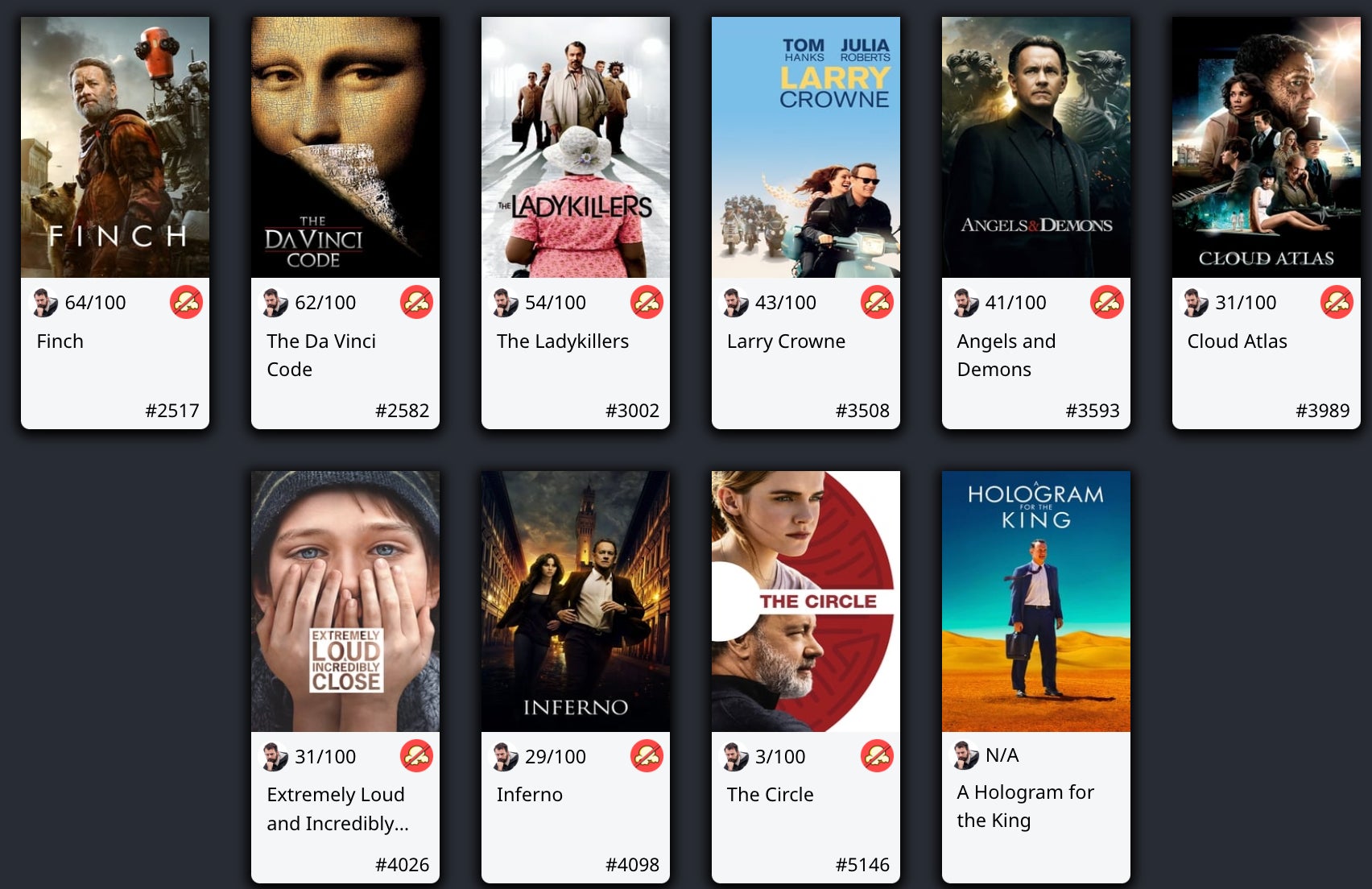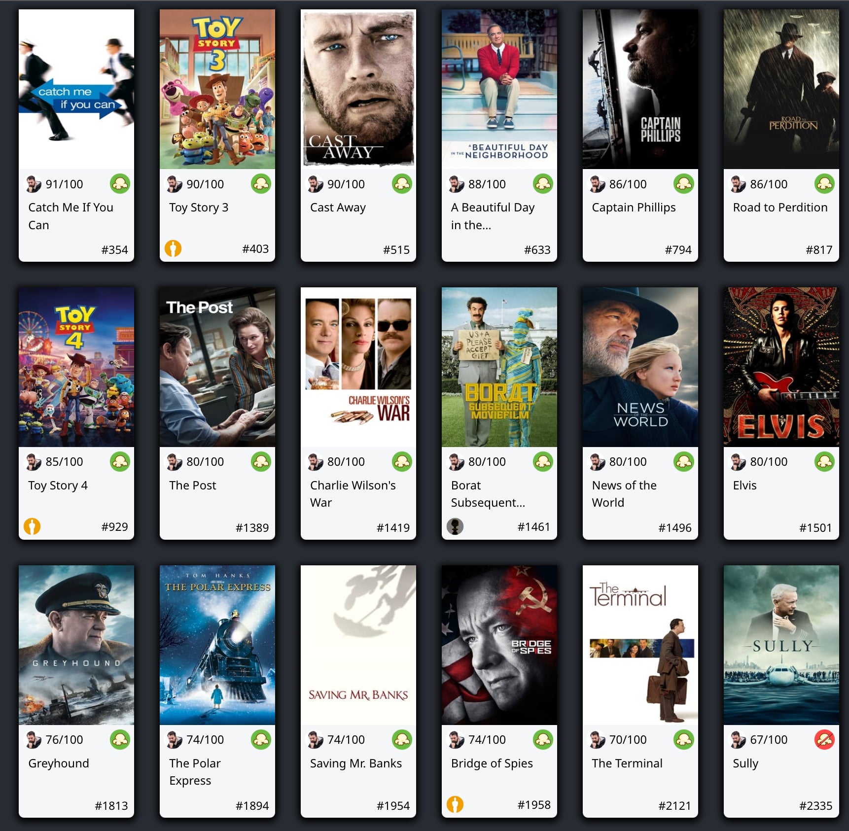 To me, this is the end of the great movies. After that, there are some solid movies that are not made better by a Hanks performance(Charlie Wilson's War, Greyhound, Bridge of Spies) and some that are made significantly worse by him (ELVIS). Not to mention the absolute garbage at the bottom of this list….