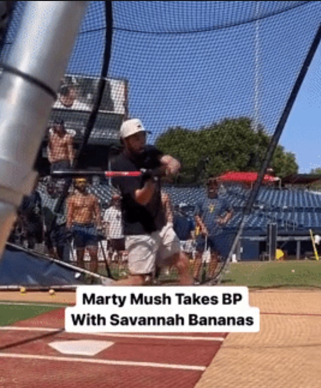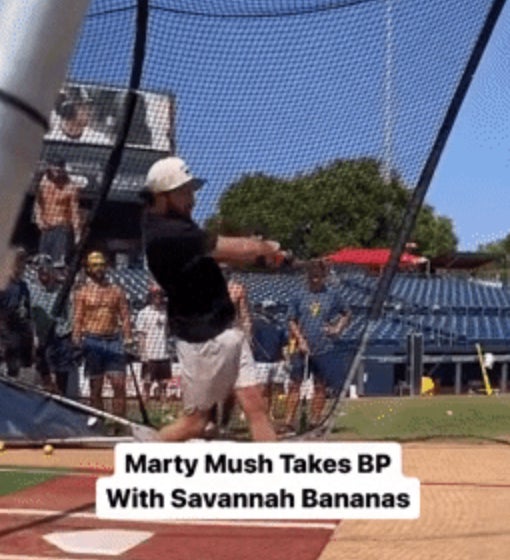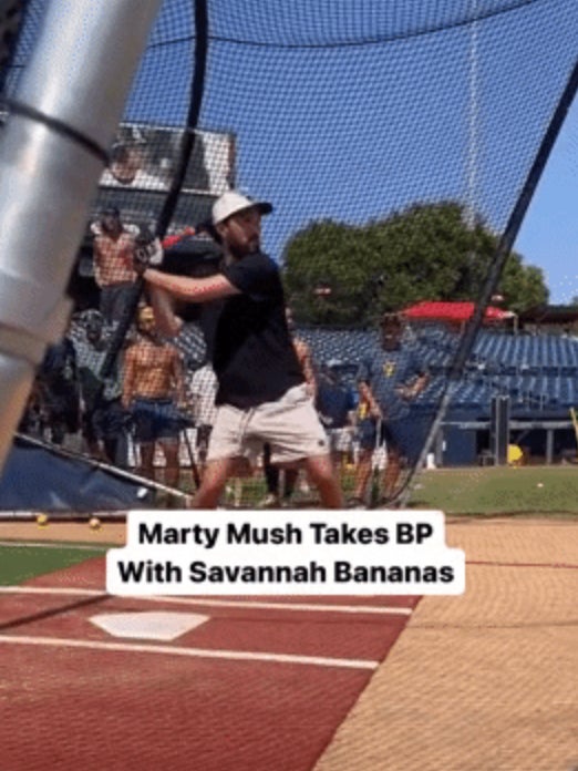 On my main timeline I was greeted by that (formerly, fuck) snaggle toothed clown dick Marty Mush trying to swing a baseball bat with the Savannah Bananas: