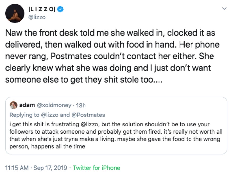 Then there was the time that same year she basically doxed a Postmates driver who she accused of stealing her food.