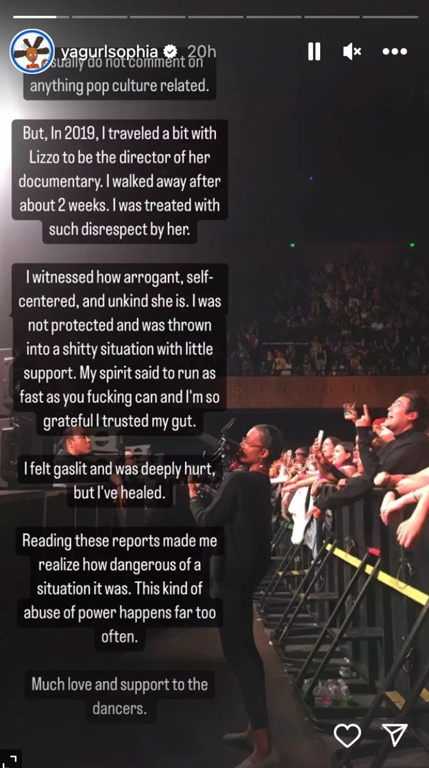 "Lizzo creates an extremely toxic and hostile working environment and undermines the work, labor and authority of other Black and brown womxn in the process," Allison claimed in a followup post on Wednesday. "Notice how the documentary ended up being directed by a cis white man."