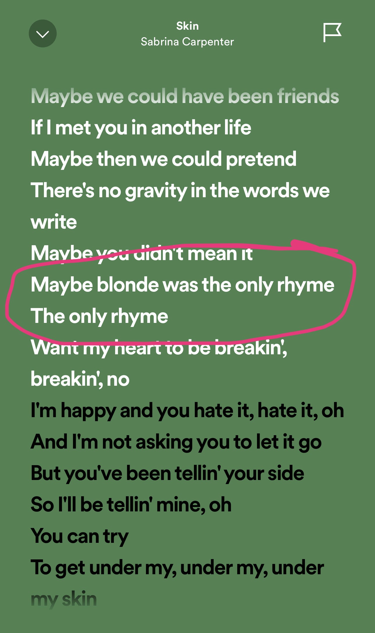 Sabrina of course, had been dating Joshua Bassett at the time, after he seemingly dumped Olivia Rodrigo. Olivia went back to the Taylor Swift school of breakup songs, and put out a major hit. Sabrina answered with her own version of events, in the song "Skin":