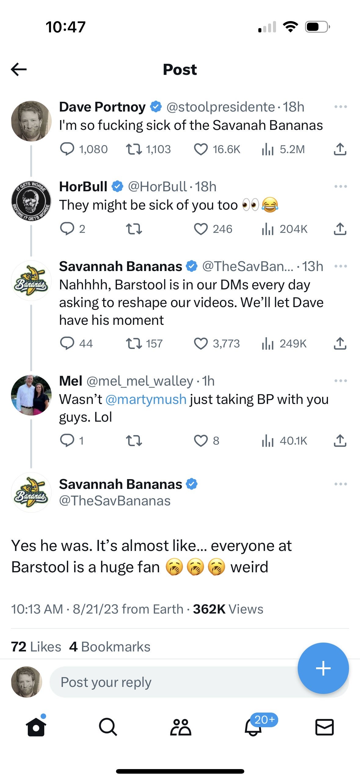 Well the Bananas reacted by trying to dunk on me saying that Barstool sucks the Bananas dick and always asks to repost their content and Marty Mush begged to take BP with them. I’m sure all of this is true and it also just confirms exactly what I was saying about the Banans. It’s lame ass content. I mean no joke I’ve sent no less than 10 texts to our social team (Bald Paul) to stop being lame on our socials since my return. Like stop fucking posting lame Instagram videos. I don’t care if they get views or likes or whatever. I know we need permission to post videos now and it’s not the wild west like it was when we were in Milton. I don’t care. Figure out a way to post not lame content that doesn’t get us shut down by Zuckerberg. Bottomline is this. Any team that invites Marty Mush to take BP is not a team that produces good content for us. Maybe for little kids and the Dude Perfect crowd it’s great, but seriously who the fuck wants to see Marty Mush take BP with the Savanan Bananass? Nobody. That’s who.