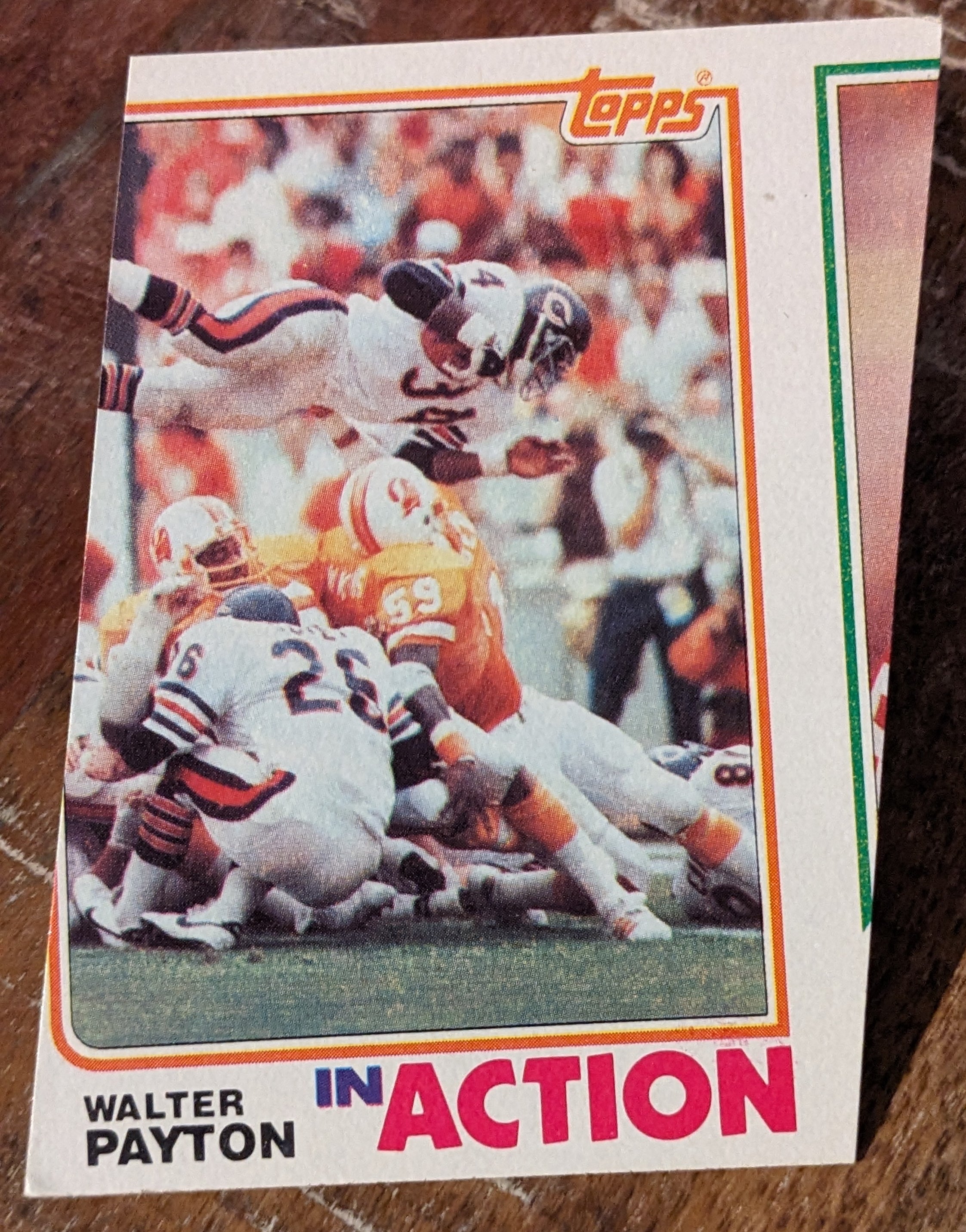 Luckily Walter Payton is here to save us. This might be one of the more badass cards of the 80s and I have the (I'm assuming) 1 of 1 miscut version that makes it appear Sweetness is diving forward to avoid getting cut in half by the wildly intoxicated card cutting machine more than going for a goal line score.