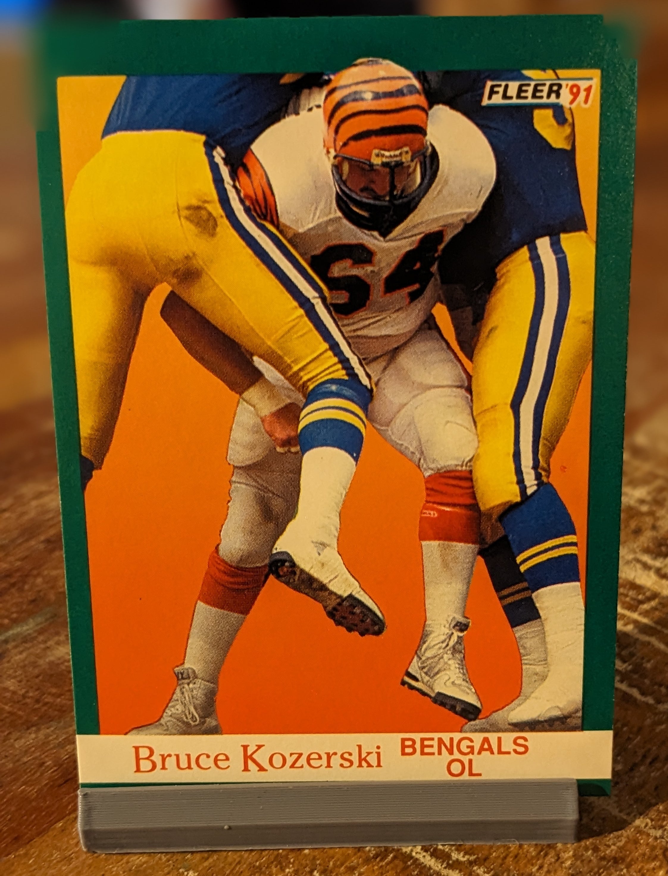 Is he catching the ball underhand? Getting ready to drop the ball for a punt?? If so this is the most uncoordinated punt attempt possible even for someone who was excused from participating in gym. It just doesn't make sense. Nothing about this card makes sense.