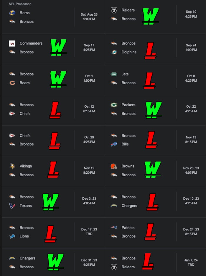 Ahead of the season, I wanted to repeat a blog from last year where I go in and predict how the AFC West schedules will play out. It will, without a doubt, be wrong because of some insane, unpredictable nonsense that will derail either one of these teams or their opponents. However, I refuse to let that stop me because I got football fever, baby.