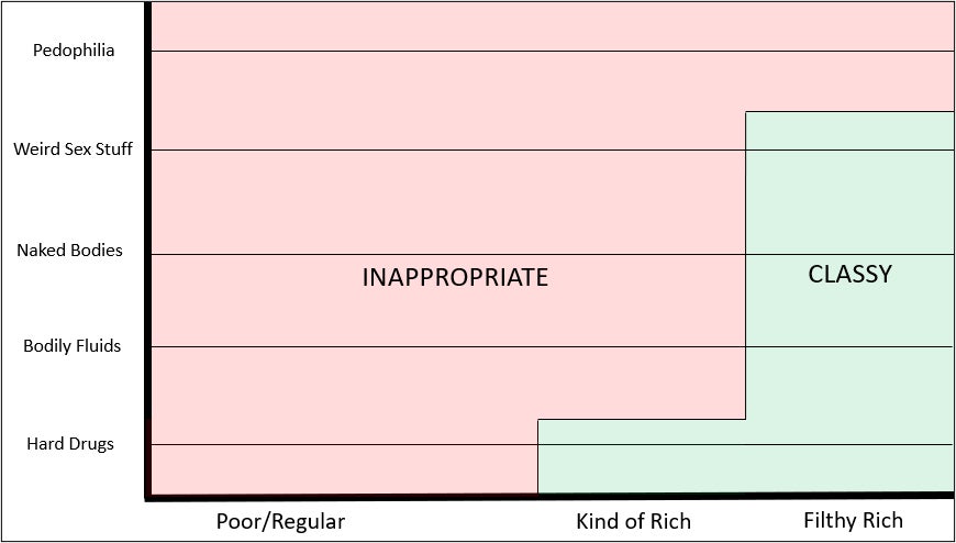 Clearly this is a very dumbed down version of my point. There are plenty more inappropriate things that could go on the vertical axis. But I think you can see what I'm driving at. Once you hit the 'Filthy Rich' income level, things that would be considered inappropriate, or even disgusting or despicable for Poor/Regular individuals become high-class.