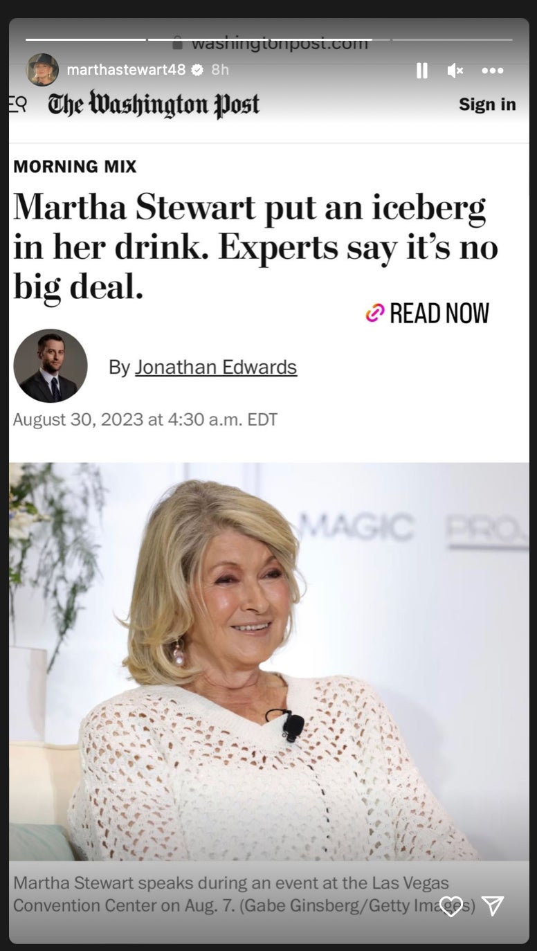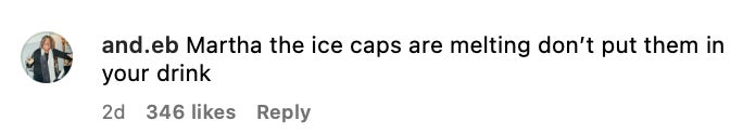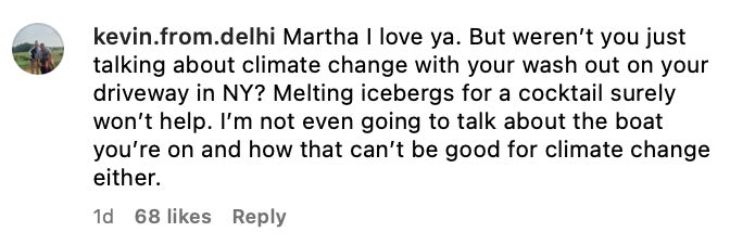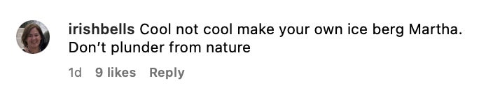 But Martha has seen the hubbub and is not bothered in the slightest, even posting on her Instagram story to let the people know experts say a 'berg cube here & there is not a big deal. Via glaciologist Eric Rignot from UC Irvine: