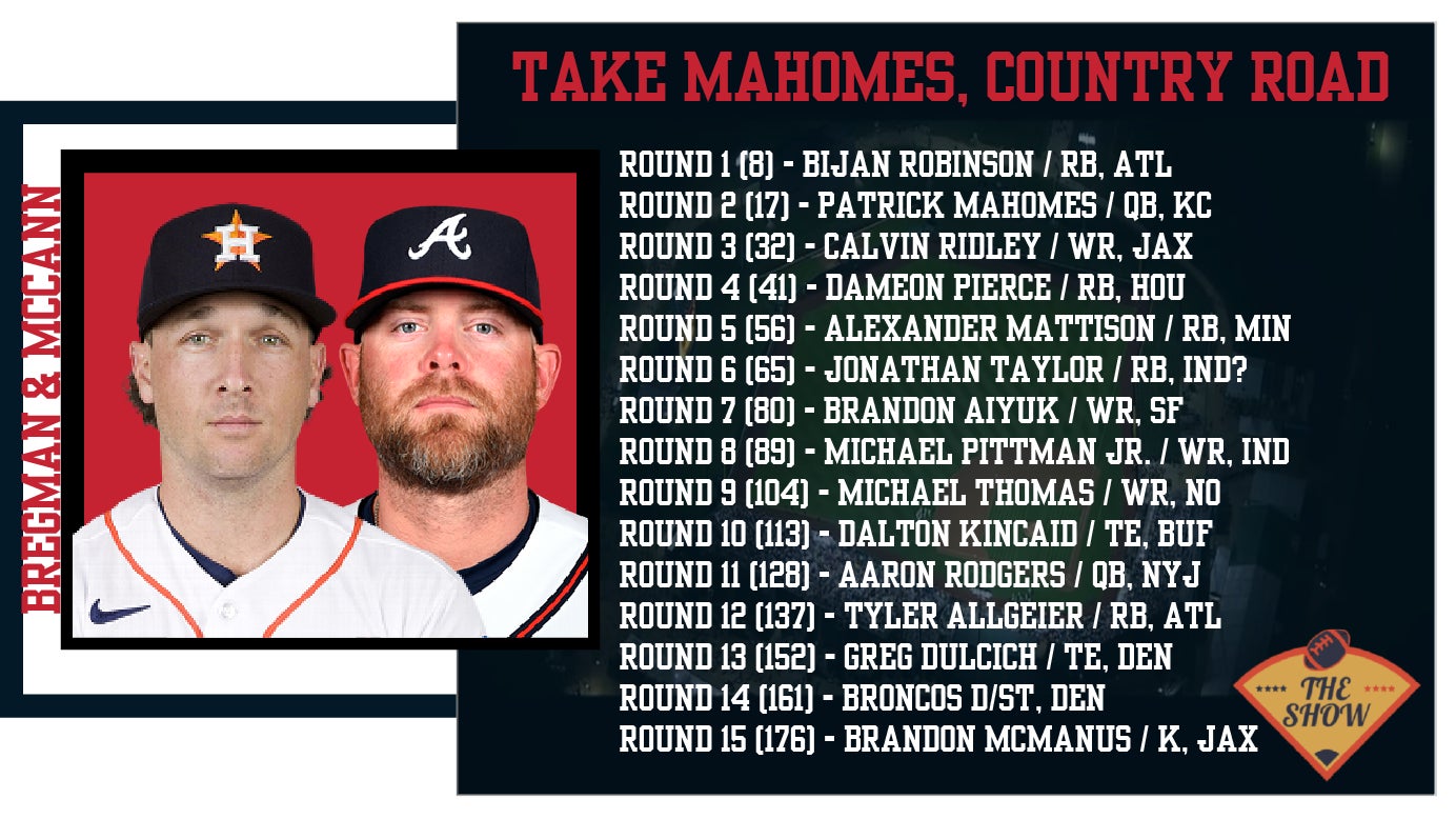 Bijan Robinson is the great unknown, but #8 is appropriate value. I would've went with a proven commodity like Stefon Diggs here, but I understand the logic. Bijan has overall RB1 ceiling, but his floor is unknown based on the weapons the Falcons have. They did a smart thing in getting Tyler Allgeier in Round 12 to handcuff their blue chipper. Patrick Mahomes at #17 overall is SUPER EARLY, but with 6-point passing TD leagues, it gives them a decent floor. Alex Bregman was a solo manager in years 1 and 2 of this league winning the first year and finishing last the second. Brian McCann comes in and they have a stable team but also took some risks. I'd point to Calvin Ridley, Alexander Mattison, Jonathan Taylor, and Michael Thomas as risks. But if two of those guys hit, this should be a playoff team. Dameon Pierce is a great RB2 and I love the Brandon Aiyuk pick in Round 7. Aaron Rodgers at #128 also gives him some trade ammo to hopefully upgrade an area that is lacking in the future. Bregman has never been shy about trades before so I expect his team to look different before Halloween.