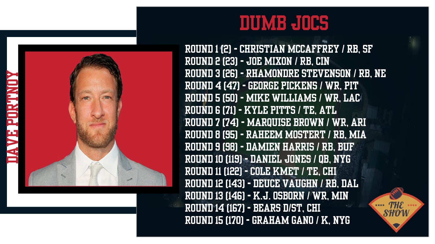 That being said, McCaffrey somehow is a steal at #2 overall. I am not a big Joe Mixon guy. He had only two 100+ yard games last year, but he did catch a career-high 60 passes. Dave will need more of that and a few more 100 yard games for that pick to pay off. I'm also not a Rhamondre Stevenson guy, but more because I don't think New England will be very good, but obviously Dave wasn't going to see eye to four eyes with me on that. But Stevenson is a guy that catches passes, having caught 69 (nice!) last year, so that helps a lot in PPR. Can he get into the end zone more than six times this year? Zeke's role in the offense is unknown publicly at the moment. I actually admire the George Pickens selection at #47. I think he has a monster year and Dave believes his convictions. Mike Williams is also another big-bodied TD scorer and plays in a dynamic offense. When healthy he is a very good WR2. Kyle Pitts is a fantasy mystery and he could be TE2 this year if Atlanta actually passes the ball, but they didn't much last year. Daniel Jones QB1 isn't ideal and where I think this Draft falls apart for me is the Cole Kmet selection at #112. I get it's an 11th round pick, but Dave was debating between Kmet and Tua Tagovailoa and given that Jones was QB1, I'd much rather have Tua there. At least then he could play the matchups. For this team to make a postseason run Dave will need a big year from Daniel Jones. I do like worthy fliers late with Raheem Mostert and Deuce Vaughn. I also know Arizona is terrible but someone will have to catch passes, so I'm not as down on the Hollywood Brown pick as Dave.