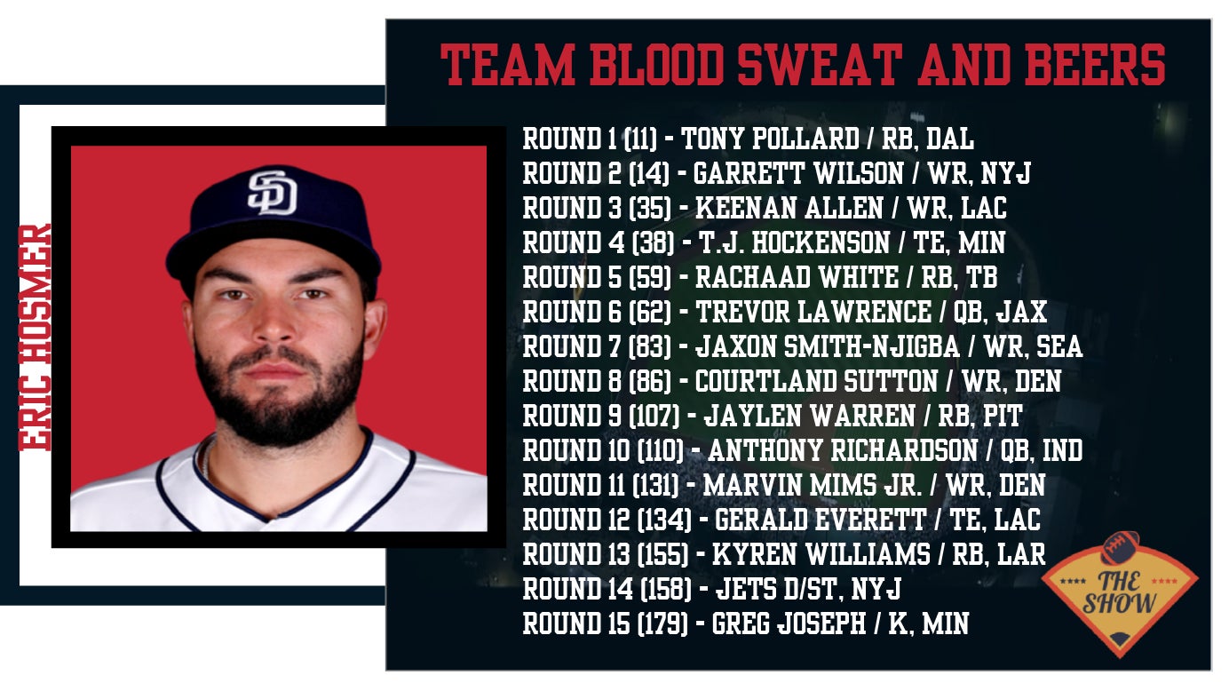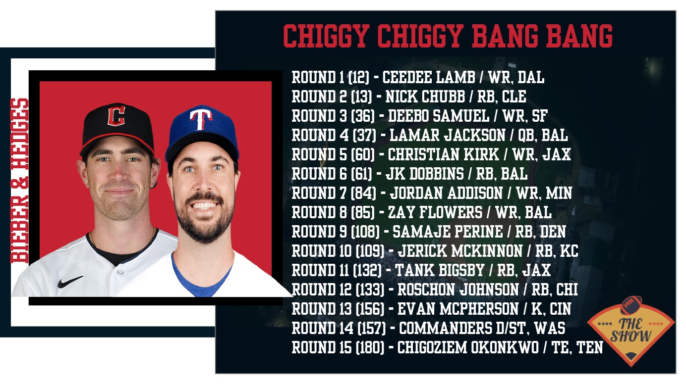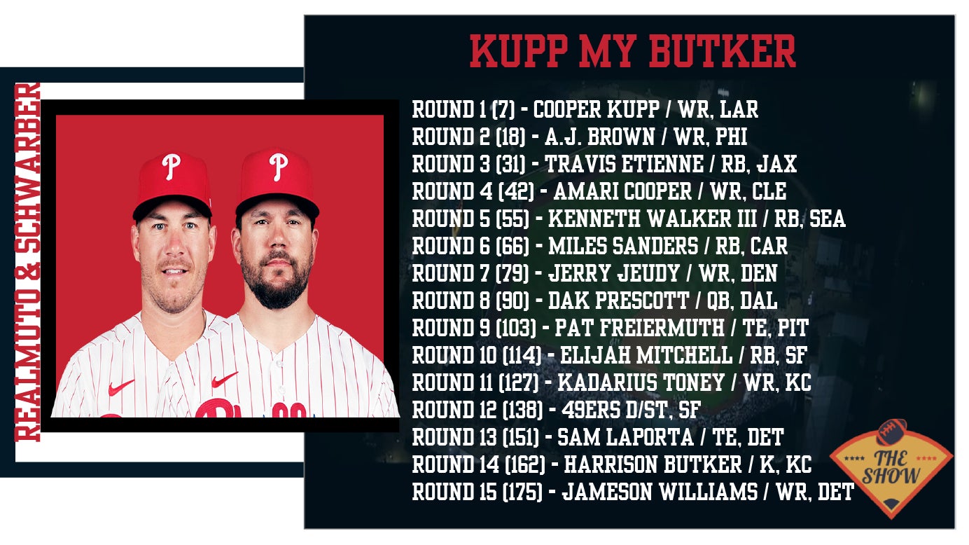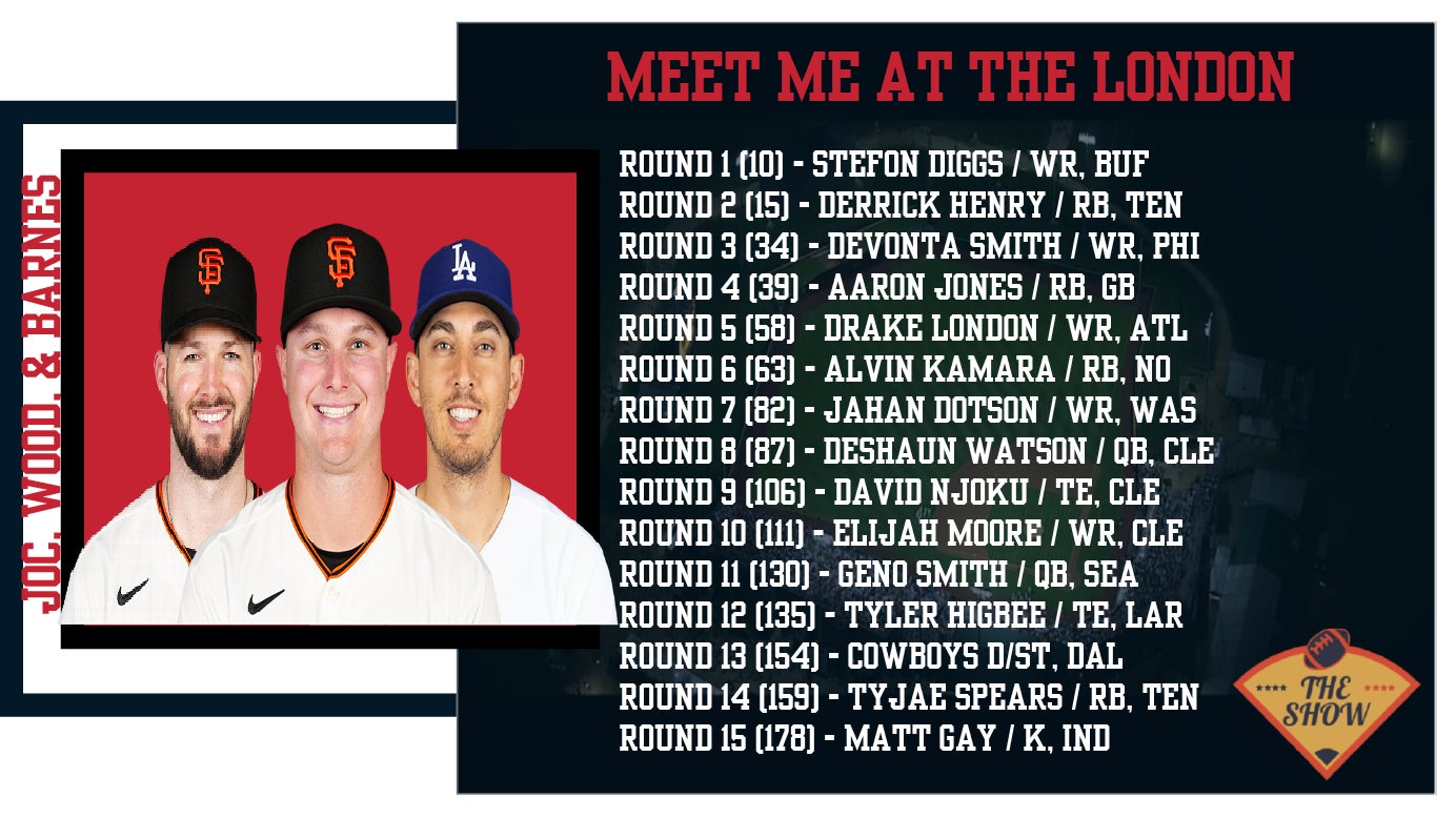 The three-headed monster that is Joc Pederson, Alex Wood, and Austin Barnes got awesome value with Stefon Diggs at #10 overall. He's been in Buffalo for three seasons and has been 100+ catches in each season averaging 113 per. Derrick Henry hasn't been much of a pass catcher, but did catch a career-high 33 times last year. If you can get 2 catches/week out of King Henry that is a win. The question is if his now 29-year old body can hold up to the rigors of another long season. I've always said DeVonta Smith was going to be an awesome pro, so I like that pick at #34. Aaron Jones and Alvin Kamara are both RBs that catch a ton of passes so play to the PPR format well. Deshaun Watson is a bit of a risk as he hasn't played good football since 2020, but anchoring his with Geno Smith was wise. The best pick of this draft is at #159 overall with Tyjae Spears who has had a dynamite preseason and is also a fail-safe in case Henry goes down.