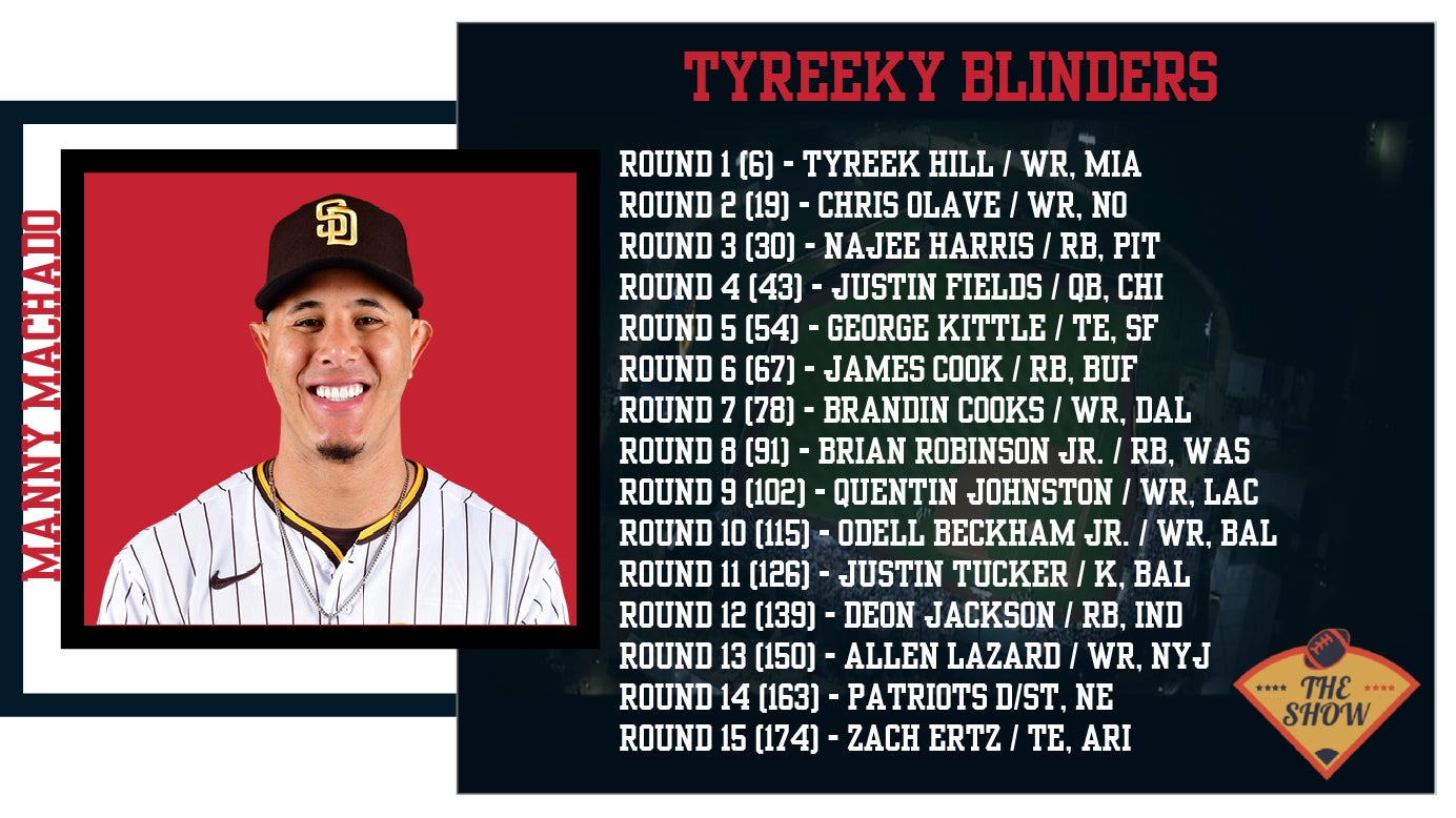 Tyreek Hill is a best case scenario at #6. In PPR I would separate a top six from the rest of the field. Hill is known as a field stretcher, but he had 119 catches on a whopping 170 targets last year too. If Tua can stay healthy, that number may rise. Chris Olave is a bit rich for me at #19, but I like Najee Harris at #30. Justin Fields was a bit of a misstep in my opinion at #43. It's early for QBs and I would've much rather had Justin Herbert in 6-point passing TD leagues. If this were 4-point passing TD leagues, I could certainly see the argument for Fields, but he'll need a big year from my guy, Just1no to justify that slot. George Kittle has big time BOOM potential as he finished with 7 TDs in his final 4 games last season. James Cook is solid value in the 6th round and he's got some really good pass catching prowess. Quentin Johnston is a good flier in the 9th round with potential to step into a WR2 spot if one of his oft-injured leads get gimpy again. But I love the Deon Jackson pick in the 12th round and is my favorite of Manny's draft. With the Jonathan Taylor situation being murky and Zack Moss having a broken arm and his Week 1 status in doubt, Jackson steps into a great spot and is a PPR dynamo. With the Colts likely to pass to RBs often I love the value here at #139. Very good draft from Manny.