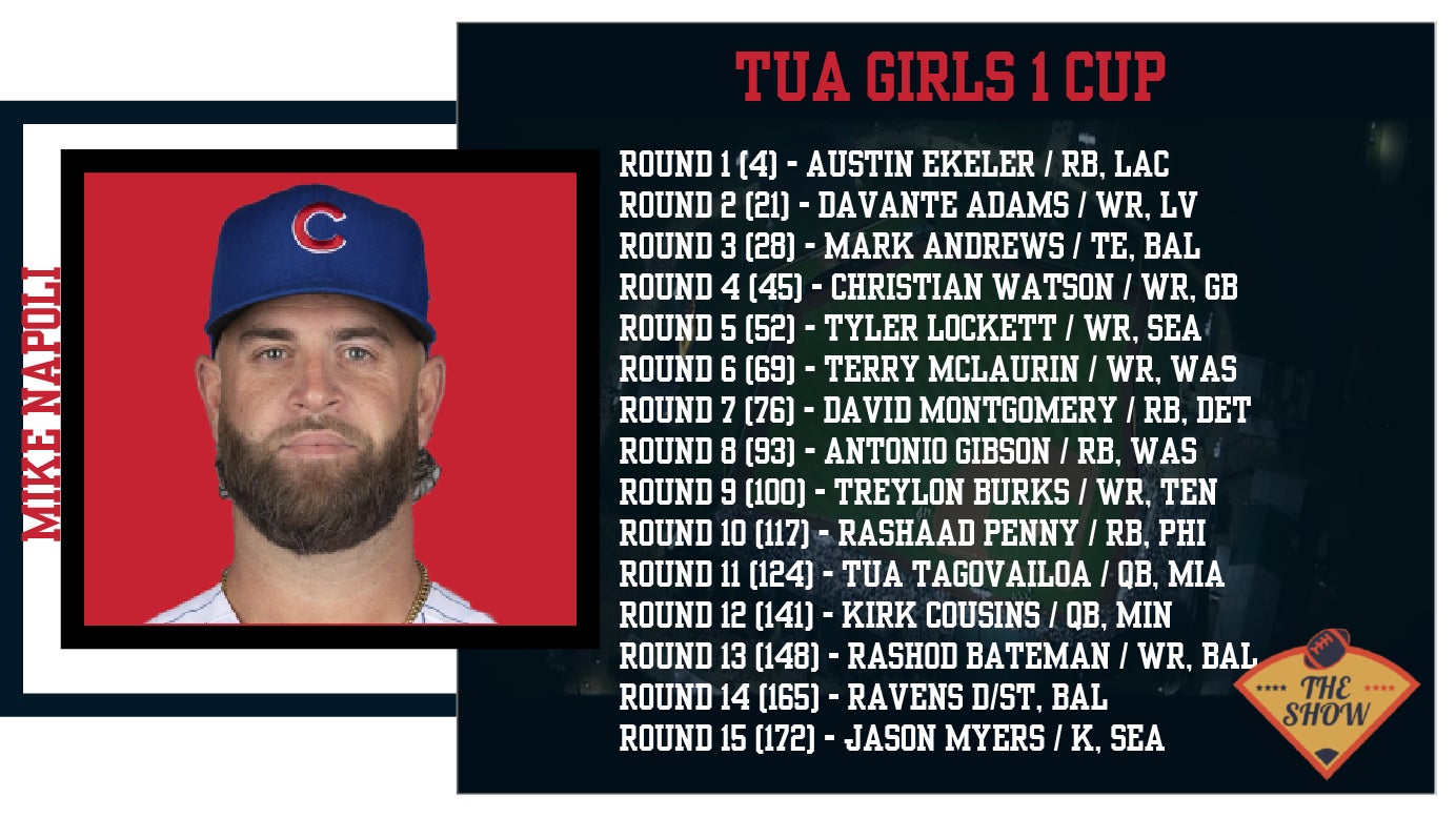 Mike Napoli understood the assignment. He showed you that with Austin Ekeler at #4 overall who in PPR leagues, is a cheat code at RB. Coming off a 107 catch season, being in an explosive offense, and having led the NFL in TDs the past two years, the only concern with him is age (28). The rest of his RBs can catch passes as well so I like the versatility in that group. I'm not as high on Davante Adams this year, but 180 targets is hard to ignore. Even if the QB play is shotty, he's going to see a ton of targets. Mark Andrews gives him a leg up at TE and it's not a deep pool so I don't mind that. Tyler Lockett is ALWAYS underrated so I like him in the 5th. Terry McLaurin is a bit nicked up now, but could be a steal in the 6th. But I really like the back-to-back QB picks with Tua Tagovailoa and Kirk Cousins. Both are low end QB1s and Nap can now start his signal caller based on matchup.