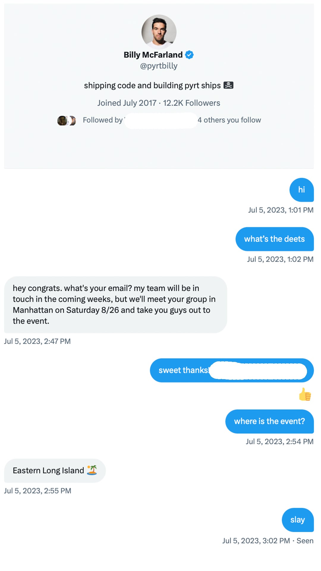 This event was supposed to be the last weekend of August. I gave Billy my email via DM but, in surprise to no one, I didn't hear back from anyone.
